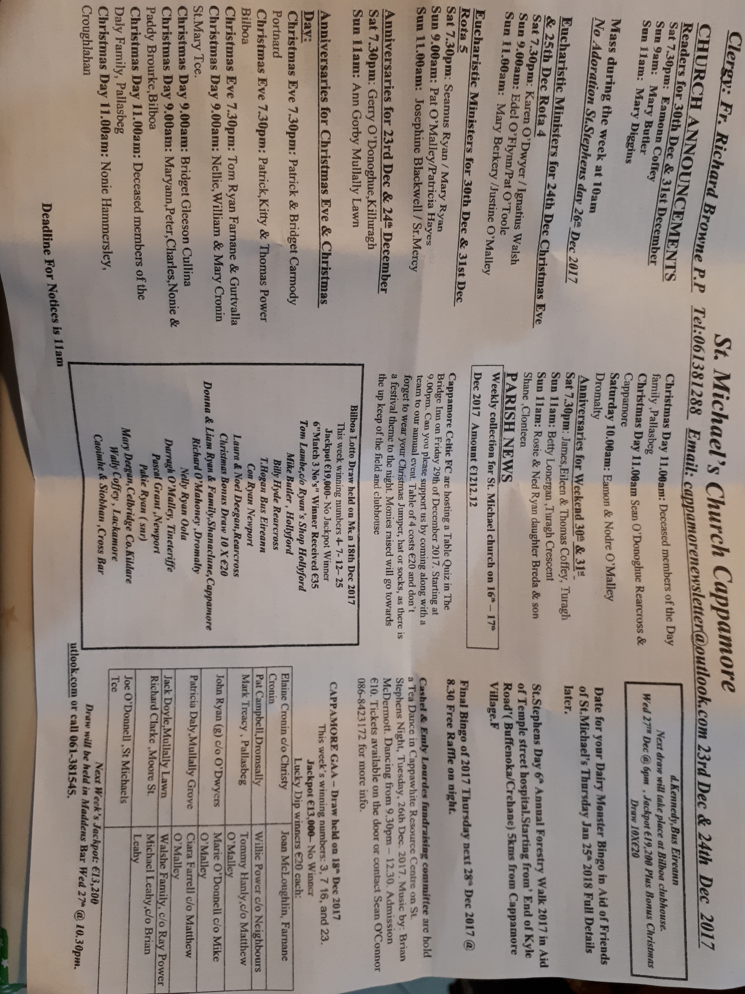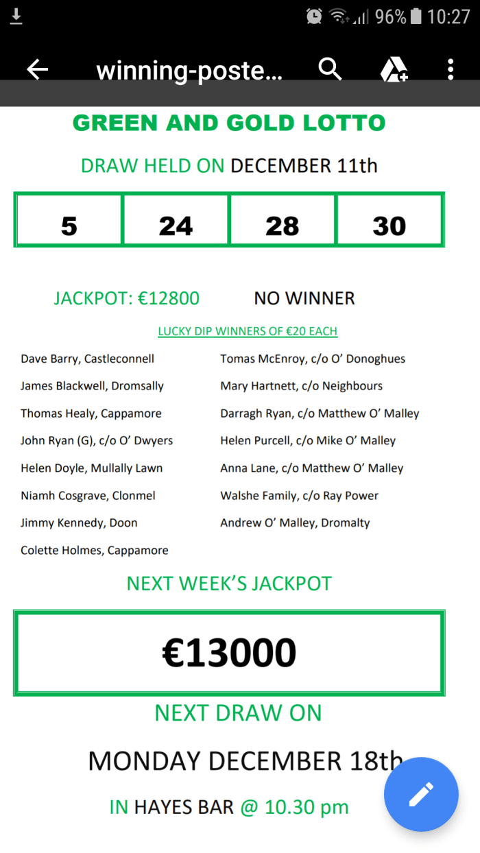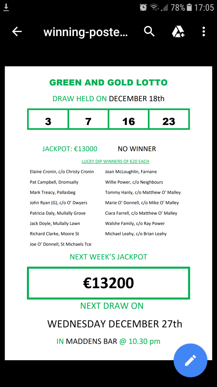 Next week’s Jackpot is €19,000 plus Bonus Christmas Draw, 10 x €20.