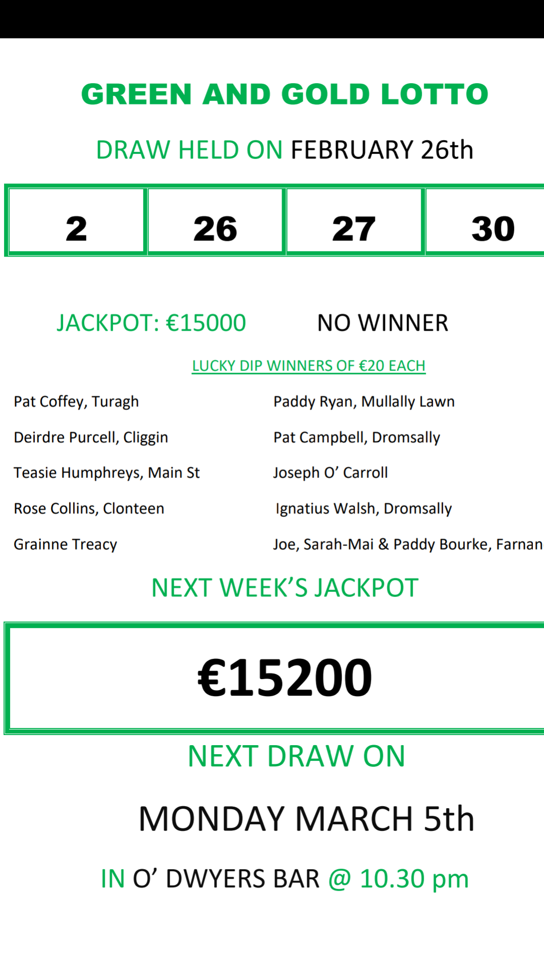 Next weeks draw in Neighbours Bar on Monday February 26.