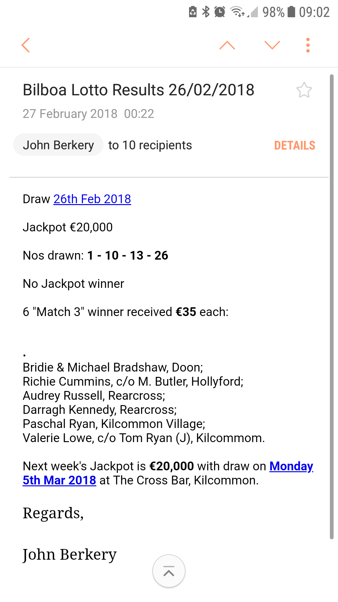 There was no winner, 10 lucky dip winners were: