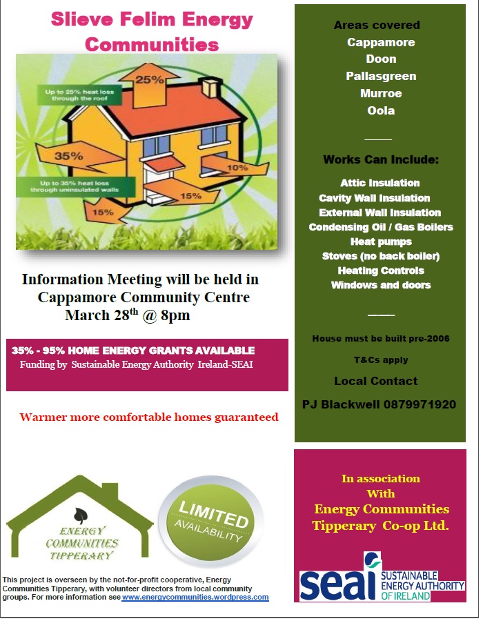 Slieve Felim Energy Committee – Information Meeting – in Cappamore Community Centre on March 28th at 8pm