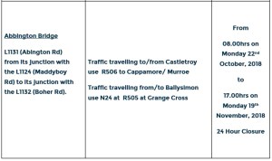 Road at Abbington Bridge L1131 closed on 22nd Oct for a month
