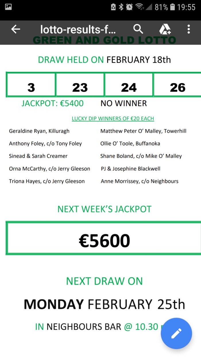 Cappamore GAA Lotto Results