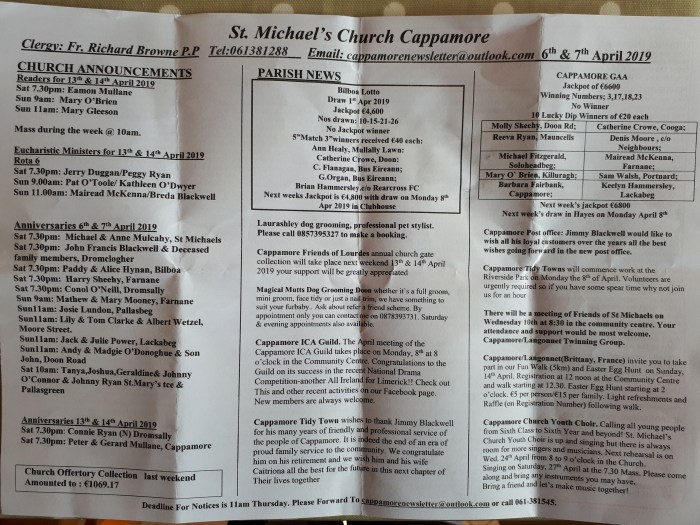 Cappamore Church Youth Choir. Calling all young people from Sixth Class to Sixth Year and beyond! St. Michael’s Church Youth Choir is up and singing but there is always room for more singers and musicians. Next rehearsal is on Wed. 24th April from 8 to 9 o’clock in the Church. Singing on Saturday, 27th April at the 7.30 Mass. Please come along and bring any instruments you may have. Bring a friend and let’s make music together!