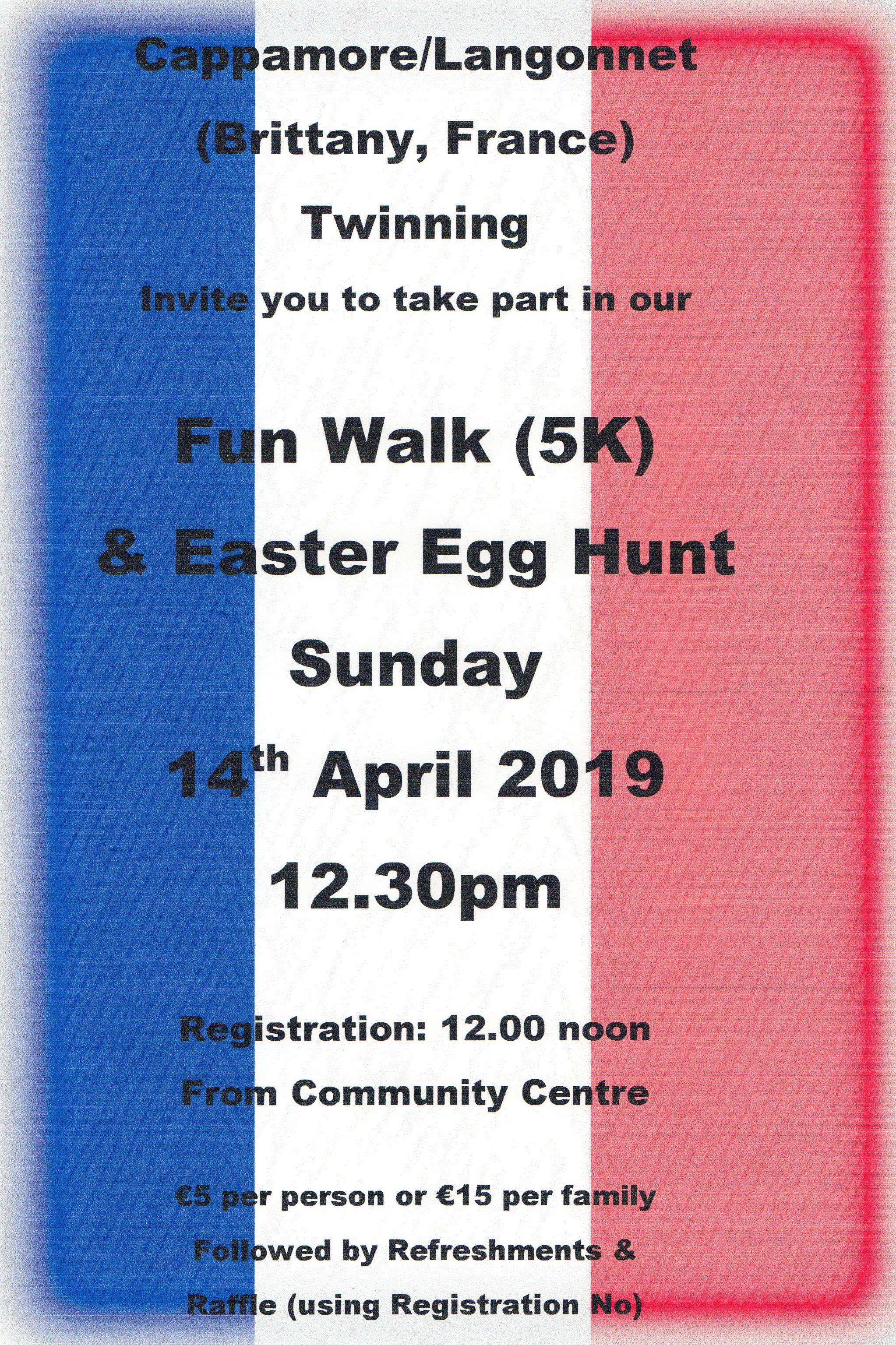 Cappamore/Langonnet Twinning Group. Cappamore/Langonnet(Brittany, France) invite you to take part in our Fun Walk (5km) and Easter Egg Hunt on Sunday, 14th April. Registration at 12 noon at the Community Centre and walk starting at 12.30. Easter Egg Hunt starting at 2 o’clock. €5 per person/€15 per family.