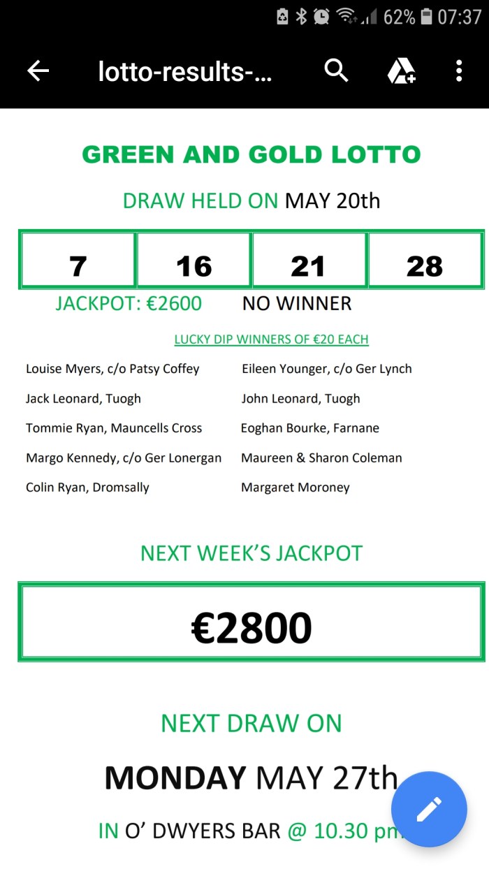 BILBOA LOTTO: Draw 20th May 2019. Jackpot €6,000. Nos drawn: 2 – 9 – 15 – 26. No Jackpot winner. 1 "Match 3" winner received €200: Brendan Heelan, c/o Noel Deegan, R/cross, FC.