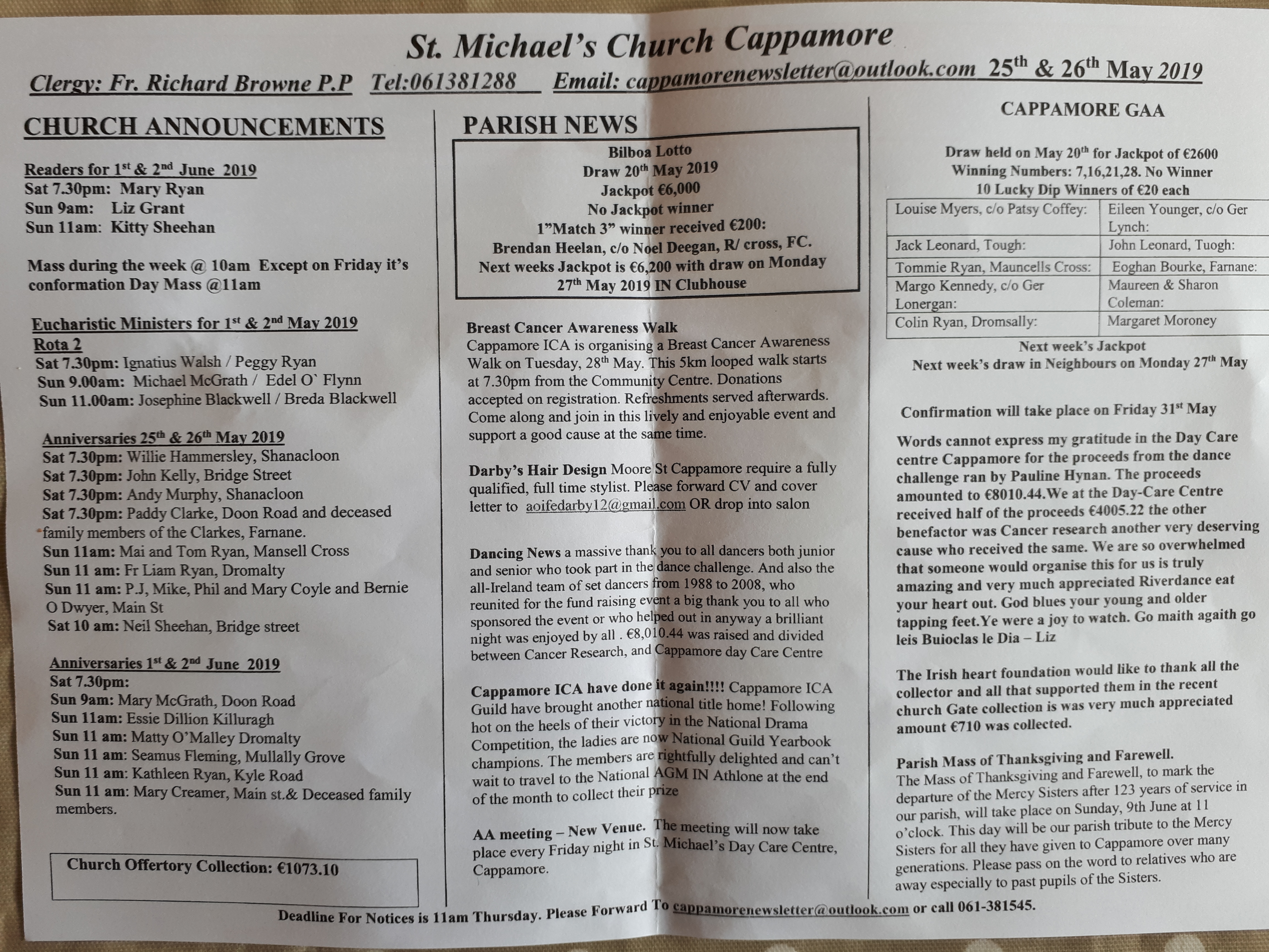 PARISH MASS OF THANKSGIVING AND FAREWELL: The Mass of Thanksgiving and Farewell, to mark the departure of the Mercy Sisters after 123 years of service in our parish, will take place on Sunday, 9th June at 11 o’clock. Refreshments will be served in the Community Centre after Mass. This day will be our parish tribute to the Mercy Sisters for all they have given to Cappamore over many generations. Please pass on the word to relatives who are away especially to past pupils of the Sisters.
