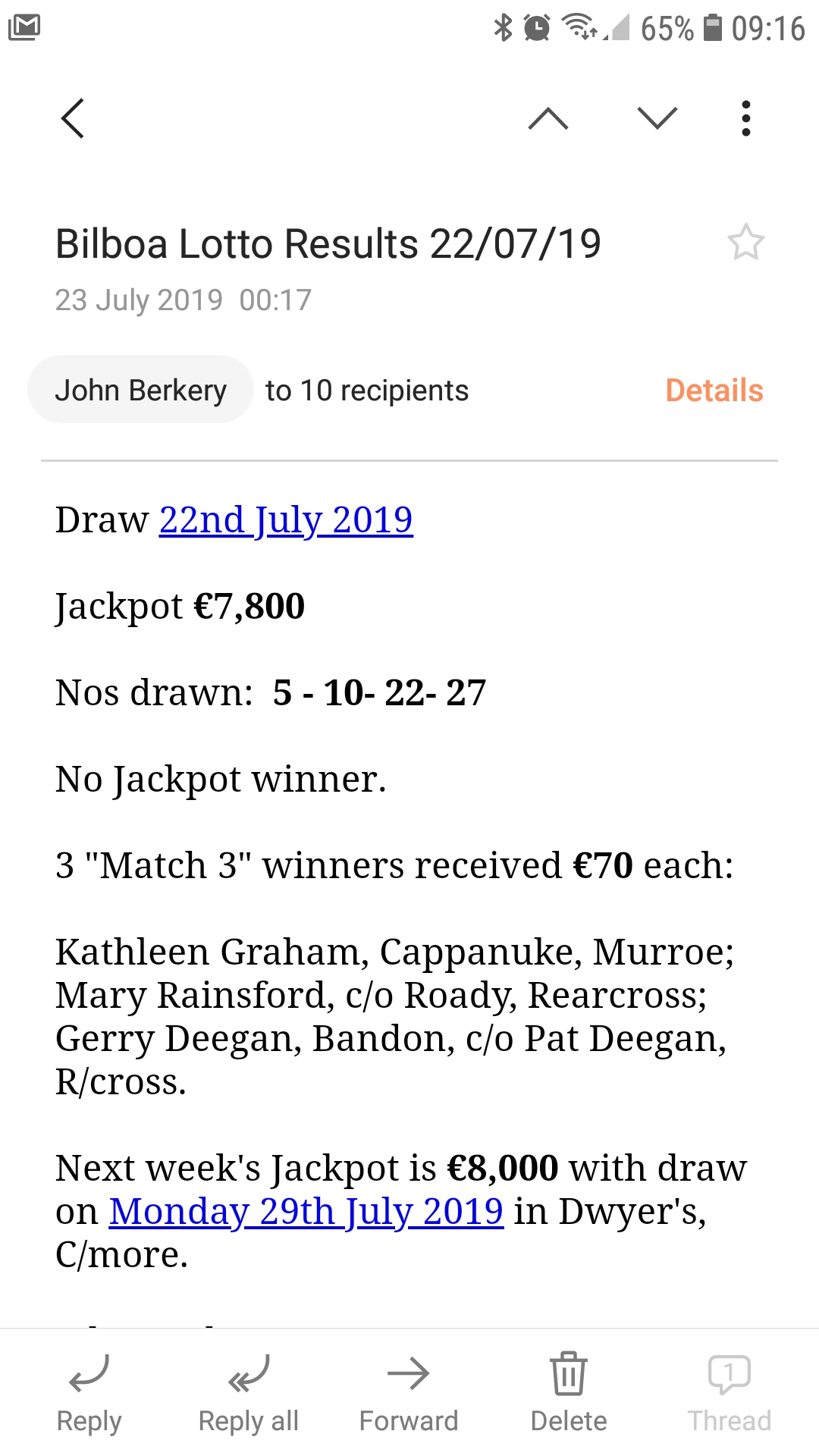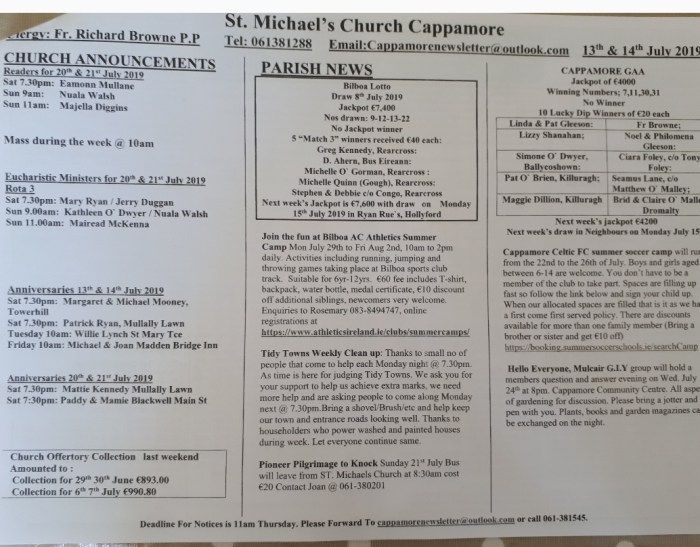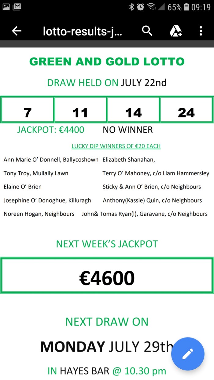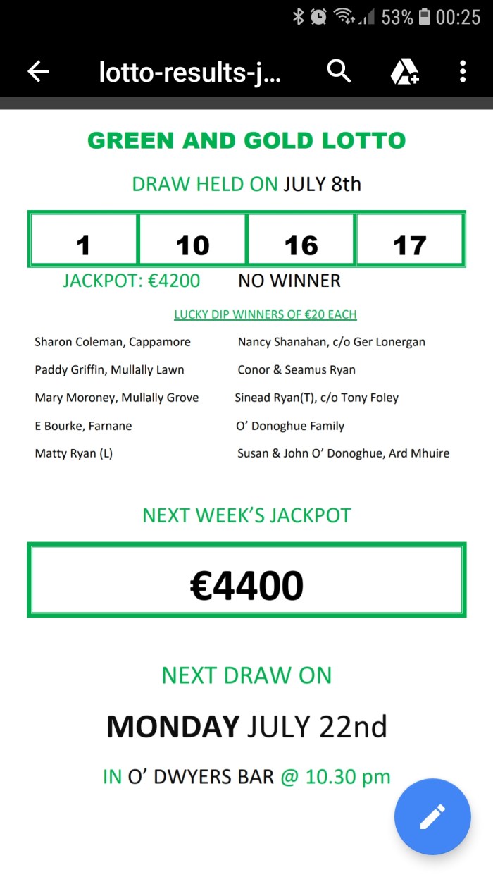 Cappamore GAA and Camogie Lotto Results Posted on July 23, 2019 by Cappamore Cappamore GAA and Camogie Lotto Results