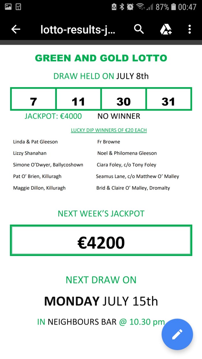 Cappamore GAA and Camogie Lotto Results Posted on July 8, 2019 by Cappamore Cappamore GAA and Camogie Lotto Results