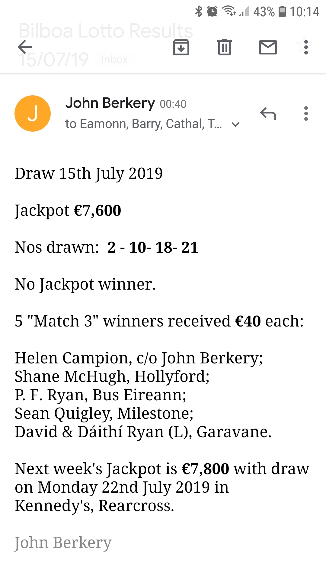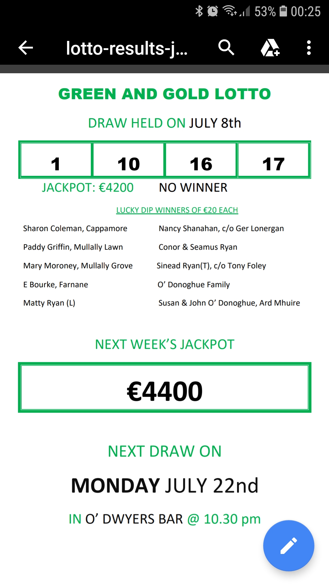 Cappamore GAA and Camogie Lotto Results Posted on July 15, 2019July 15, 2019 by Cappamore Cappamore GAA and Camogie Lotto Results