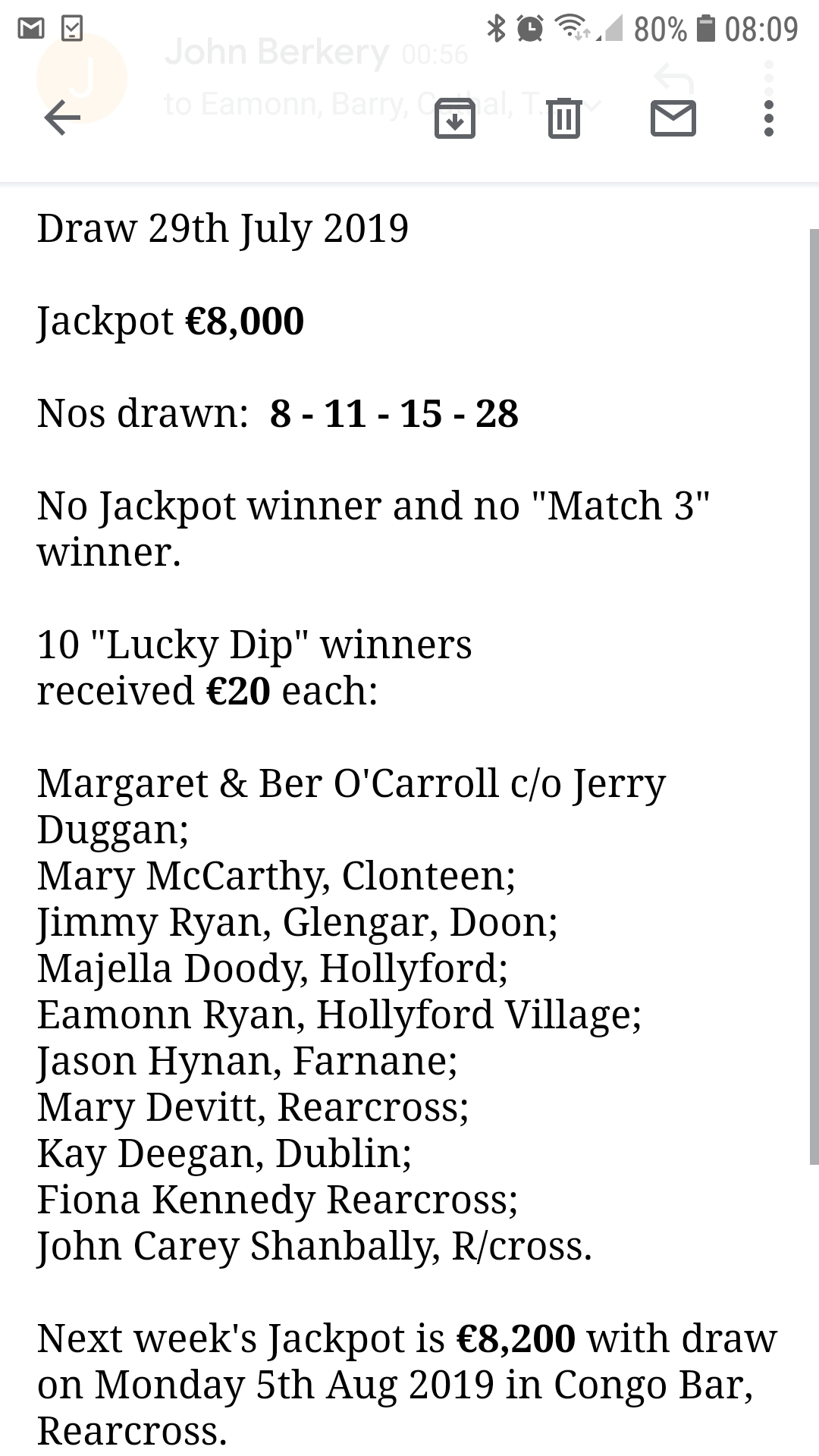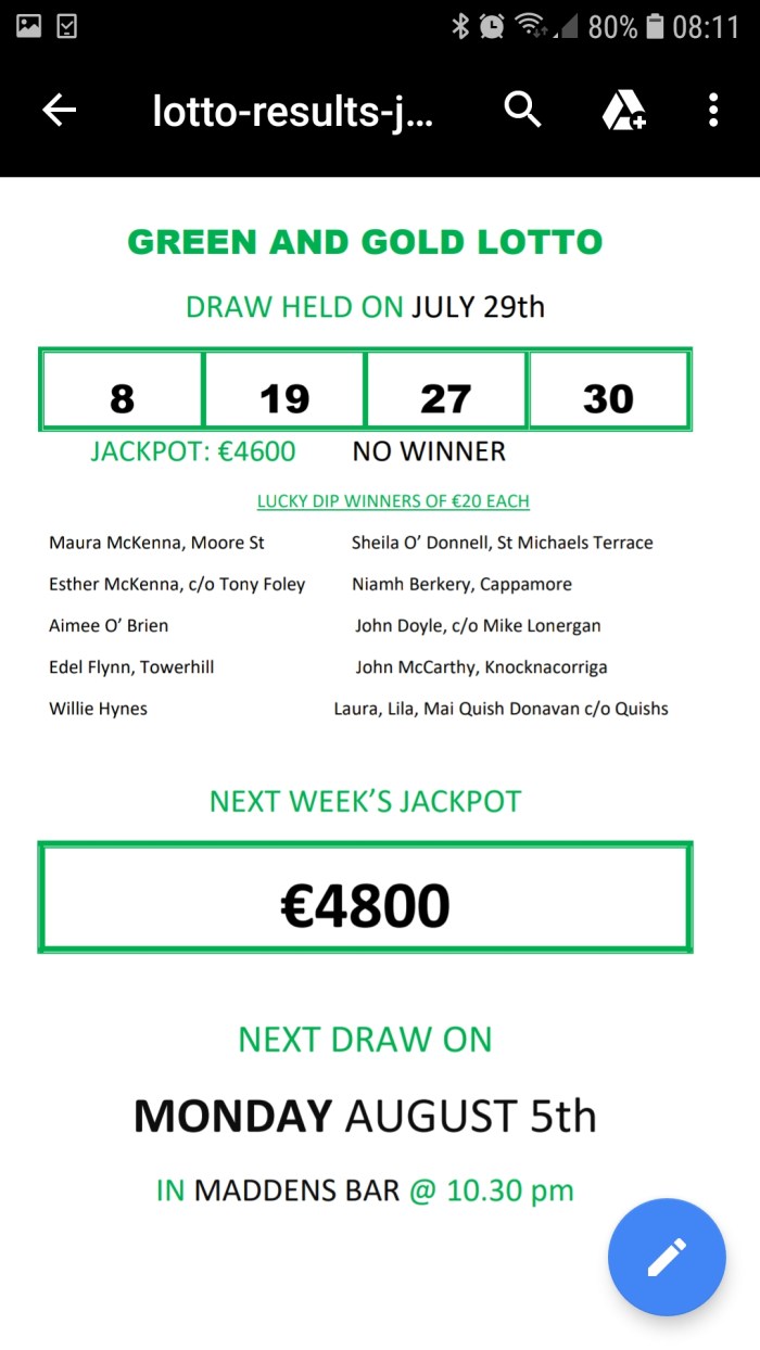Cappamore GAA and Camogie Lotto Results Posted on July 30, 2019July 30, 2019 by Cappamore Cappamore GAA and Camogie Lotto Results