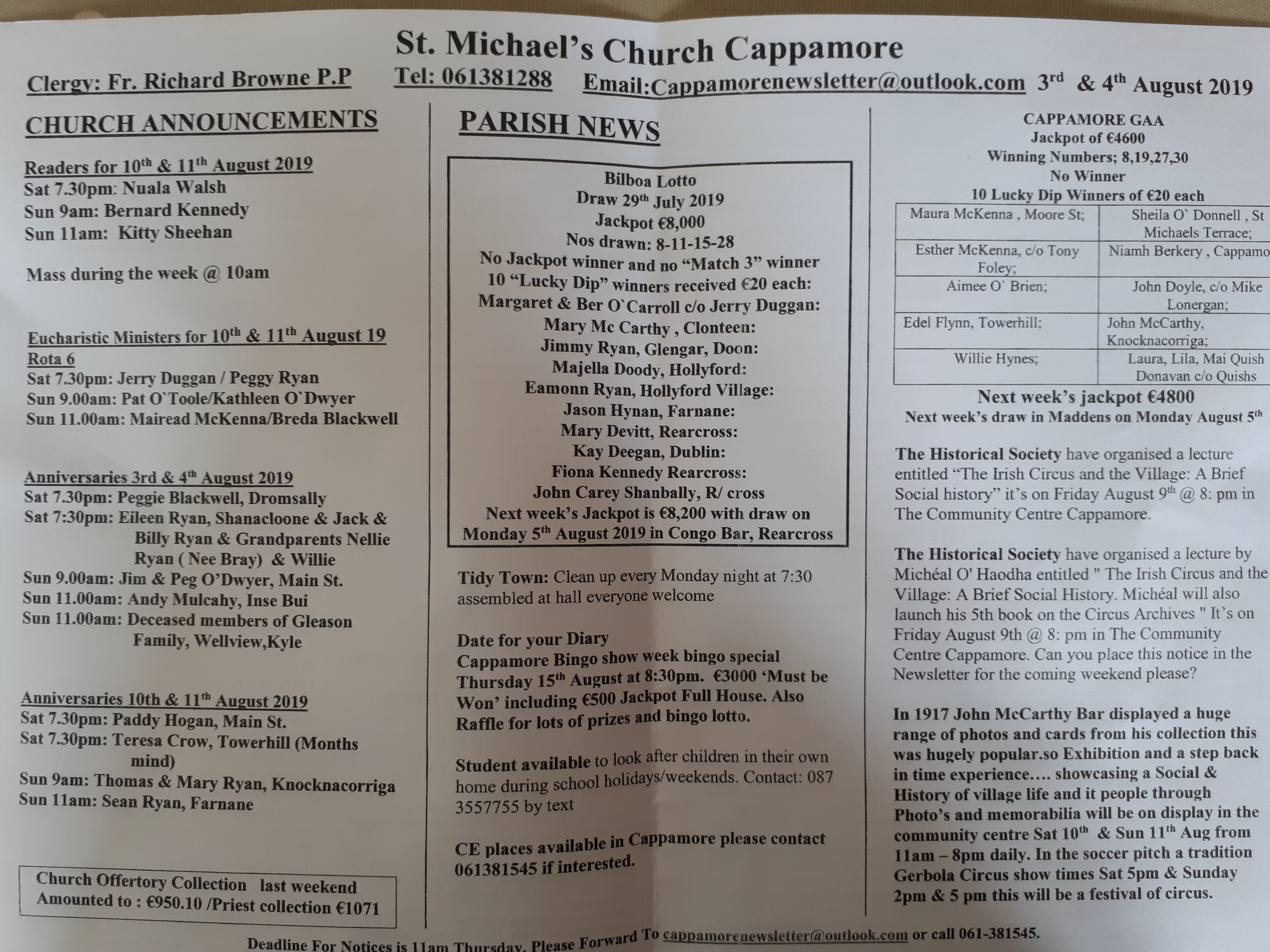 Cappamore Church and Parish Newsletter Posted on August 4, 2019July 3, 2023 by Cappamore Cappamore Church and Parish Newsletter