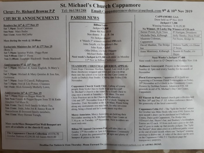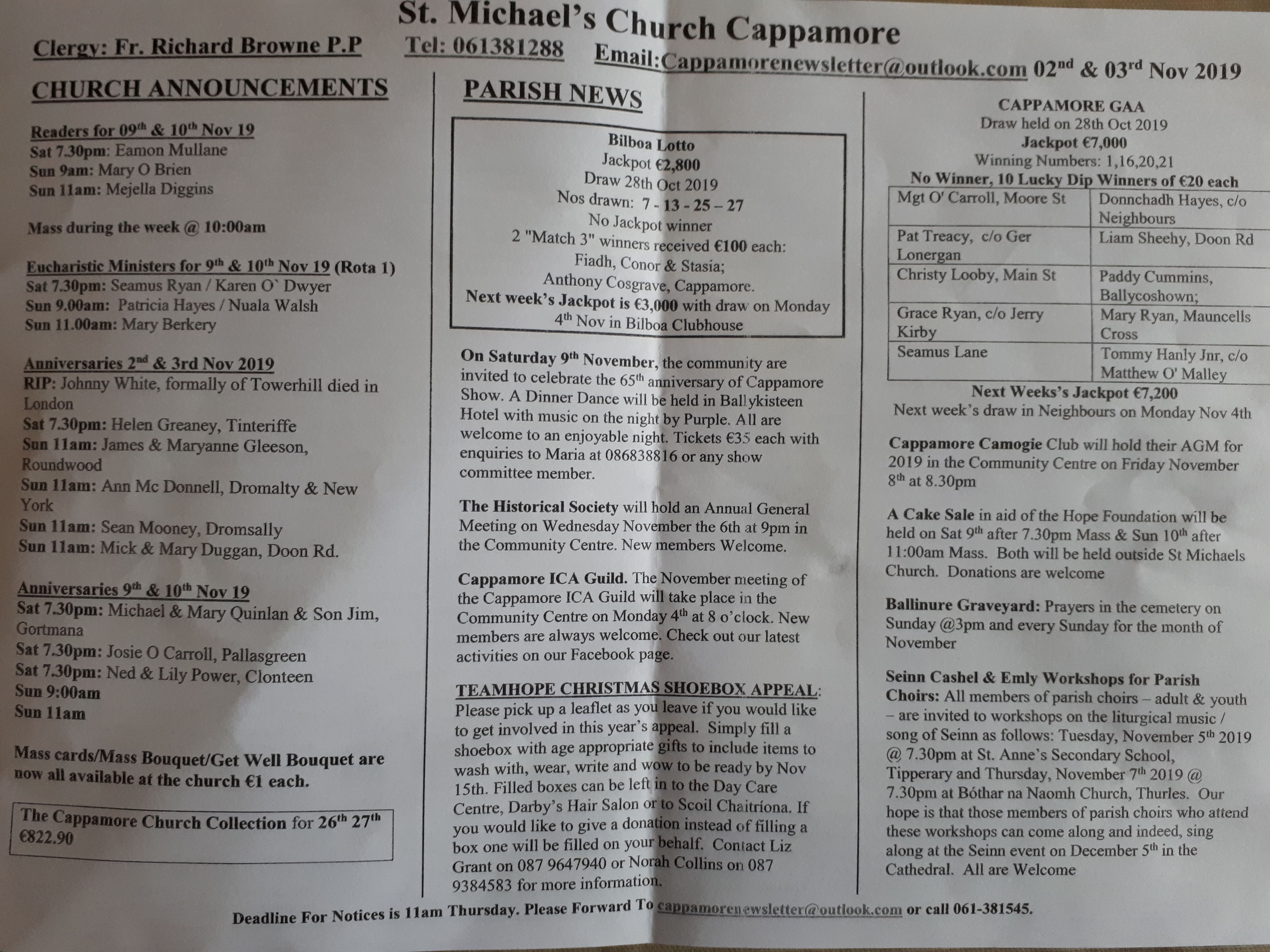St. Michael’s Church is the venue for a Youth Choir to sing once a month at Saturday’s 7.30 Mass. The next Choir Practices are in the Church on Wednesday,13th and 20th. November from 8 to 9 o’clock. Singing on Saturday,23rd. November at the 7.30 Mass. Please bring along any instruments you may have. So why not come along, bring a friend and let’s make music together.