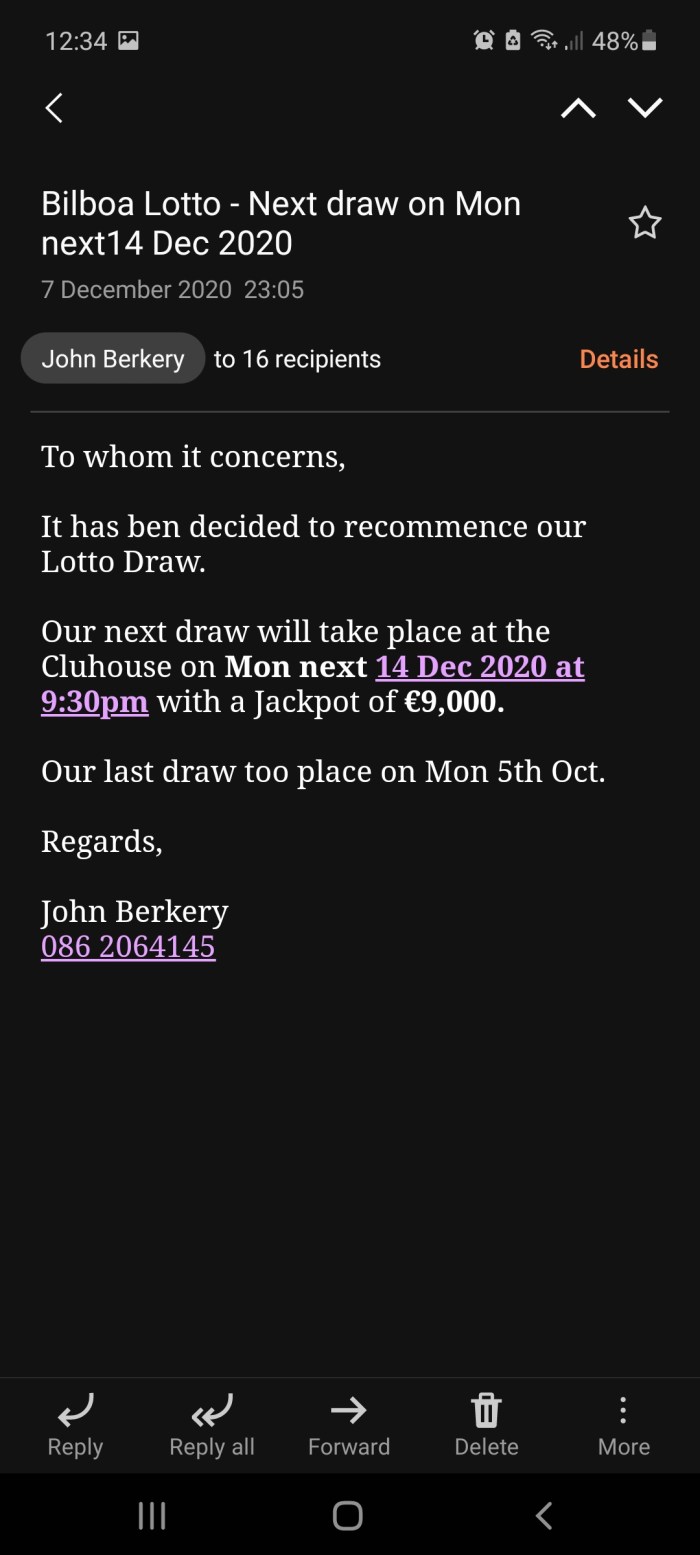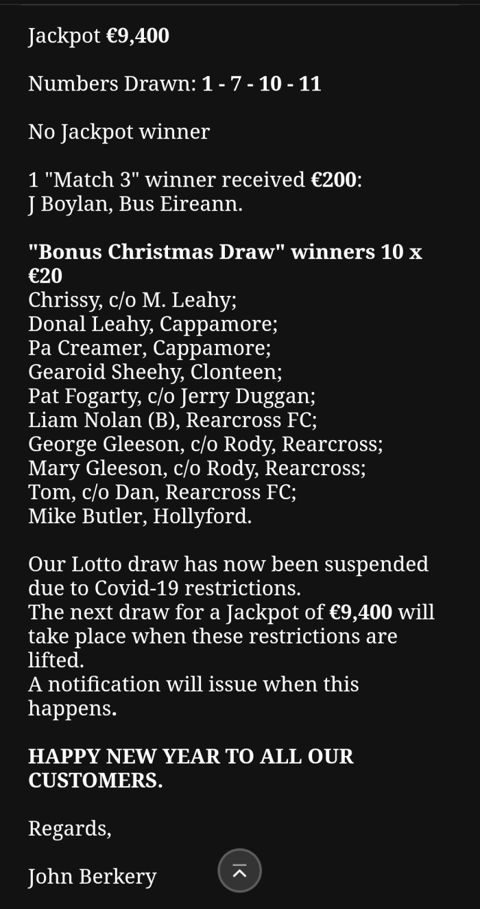 Cappamore GAA and Camogie Club Lotto Results