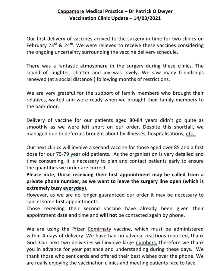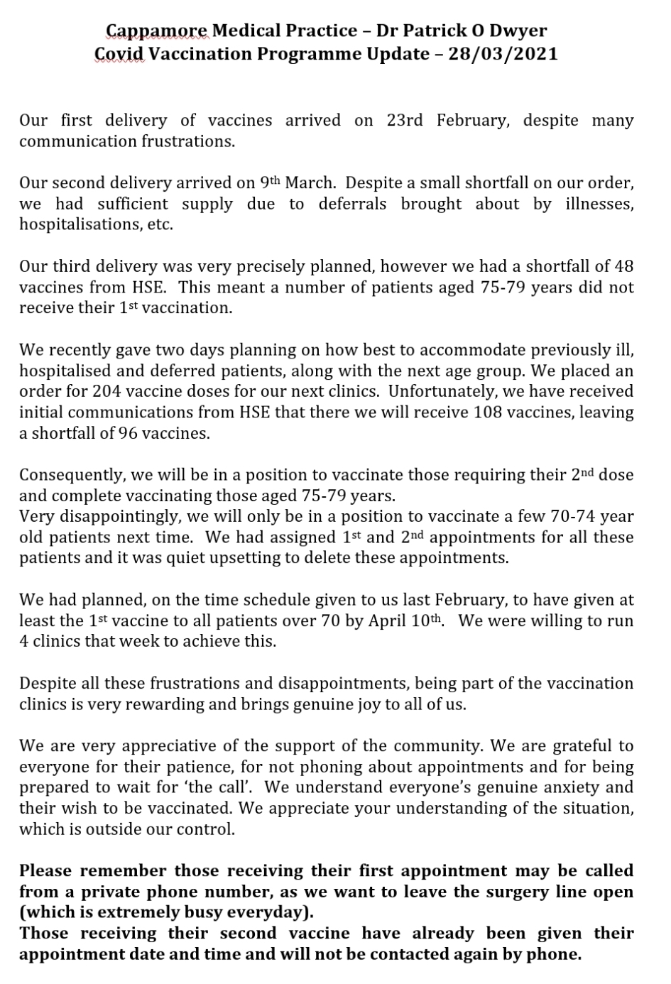 Congratulation to Evan Coleman who won €266 in the recent February Spilt the Bucket that was held outside the clubhouse. The winning ticket was pulled by John Hayes of Hayes Bar and Restaurant. All matches and training are all still suspended until further notice. Also congratulations to former club player and local man Tadhg Ryan who made his debut for Treaty United as goalkeeper. This was a the first pre-season friendly before the SSE first division league starts later this month. Well done Tadhg.