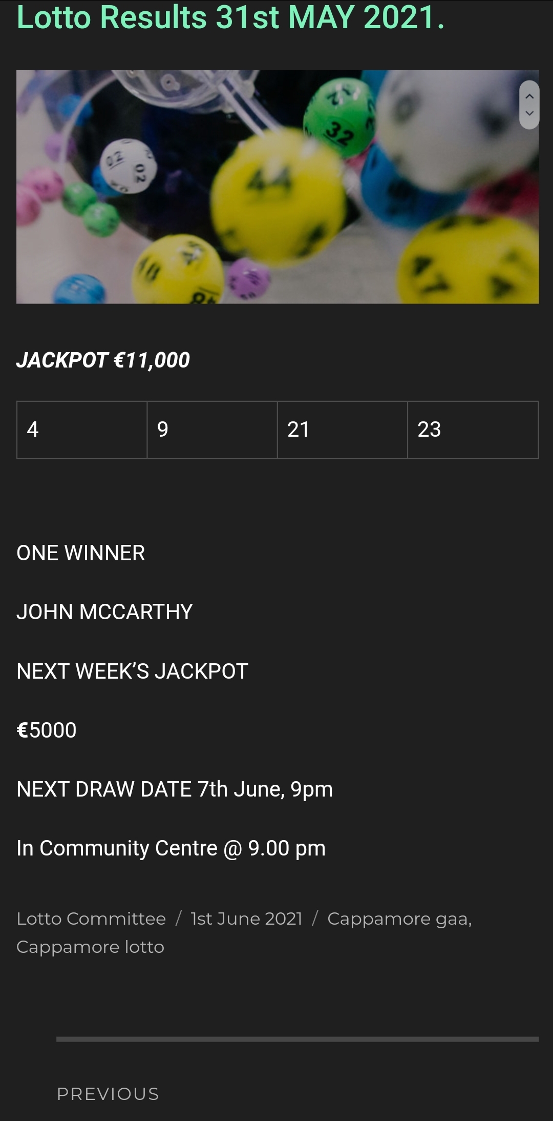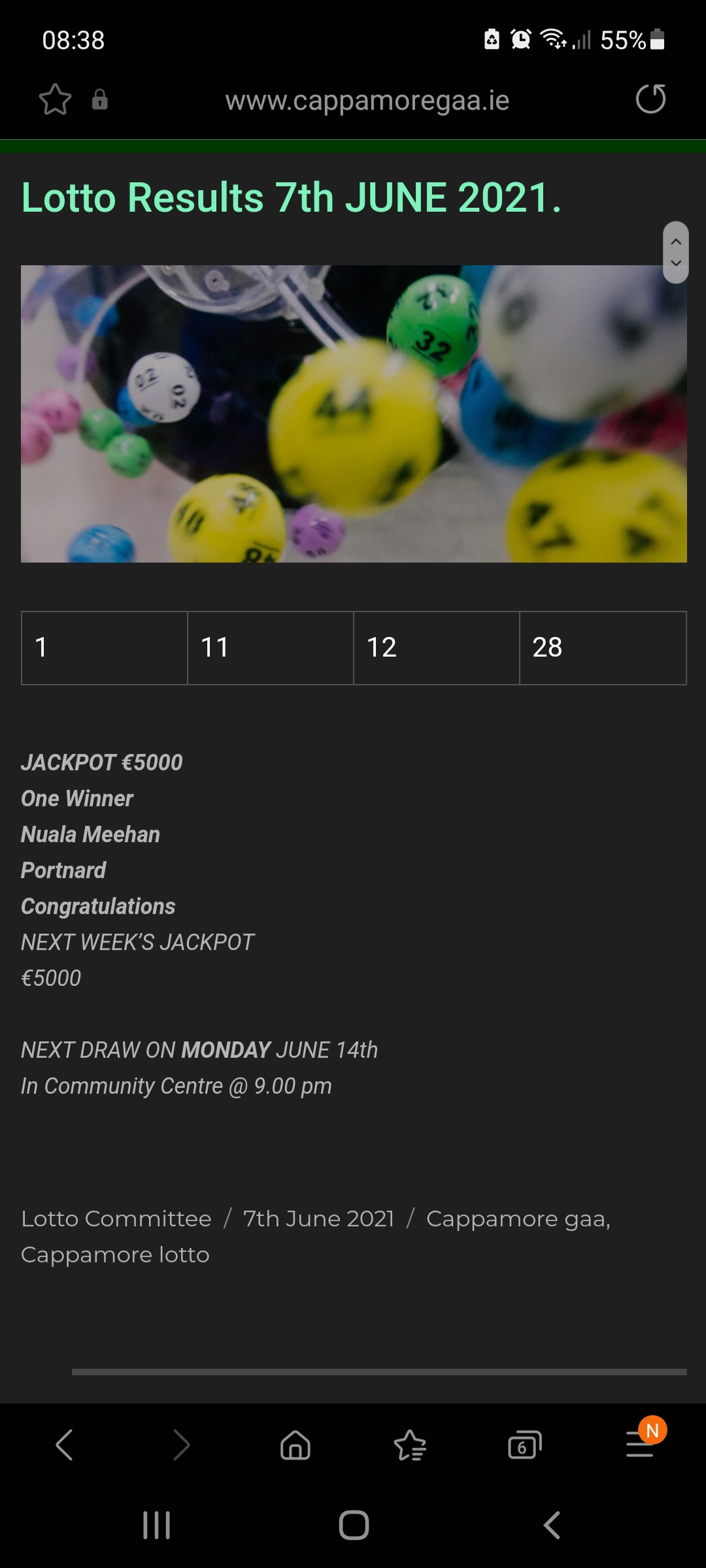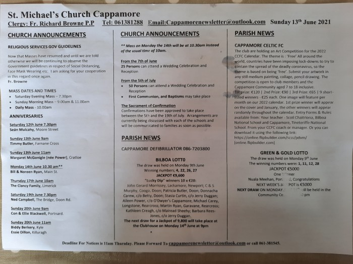 The lotto was won again and this time it is lucky Nuala Meehan. The winning numbers were 1, 11, 12, 28 and the Jackpot was worth €5000. The next Jackpot will be €5100, if it is not won at the 14 June draw being held at the community centre. Well done Nuala.