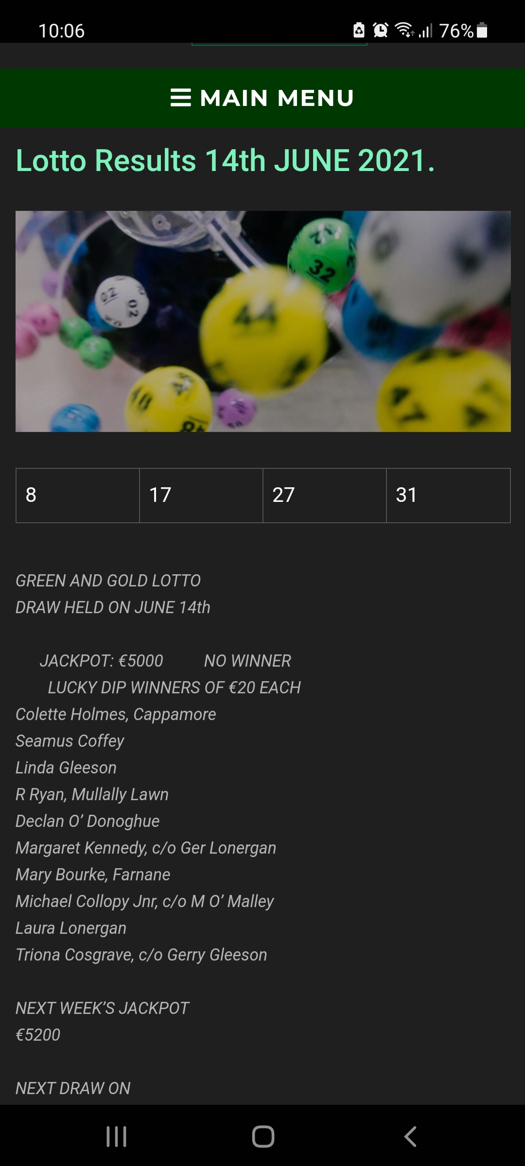 The next draw for a Jackpot of €10,000 will take place at the Clubhouse on Mon 21st June at 9pm.