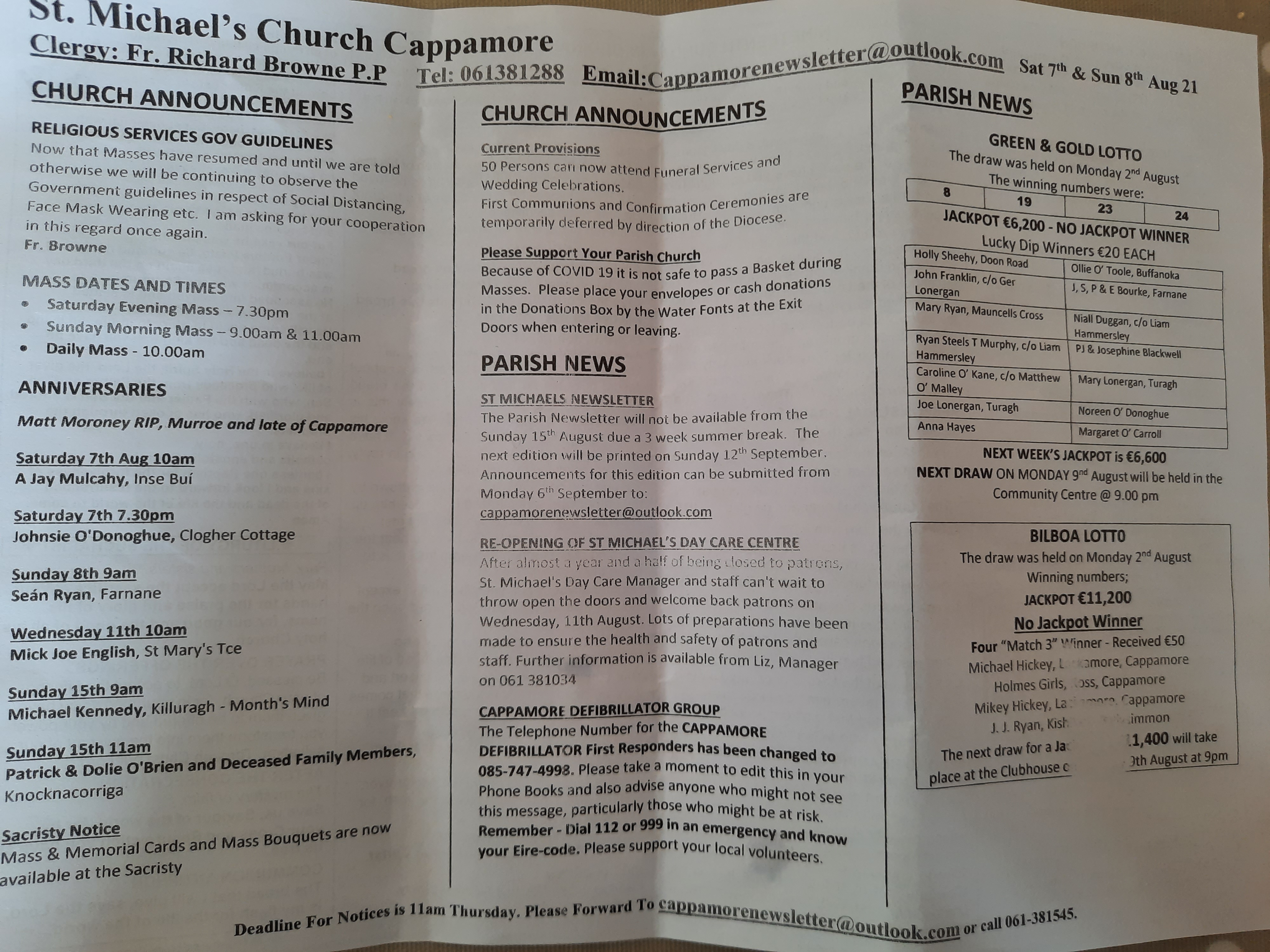 Green and Gold Lotto draw was held on Monday August 9th for Jackpot of €6600 and there was no winner. Lucky Dip winners of €20 were Roger Ryan, Mullally Lawn; Anna Ryan, c/o Tony Foley; Paddy McCormack, Dromsally; Bernadette Leonard, Killuragh; Dolores Taaffe Snr, Portnard; Helen Moore, Portnard; P, M & M, c/o Pat Maher; Paul McCormack, c/o Matthew O’ Malley; Pauline Hynan; Sean McKenna, c/o Tony Foley.