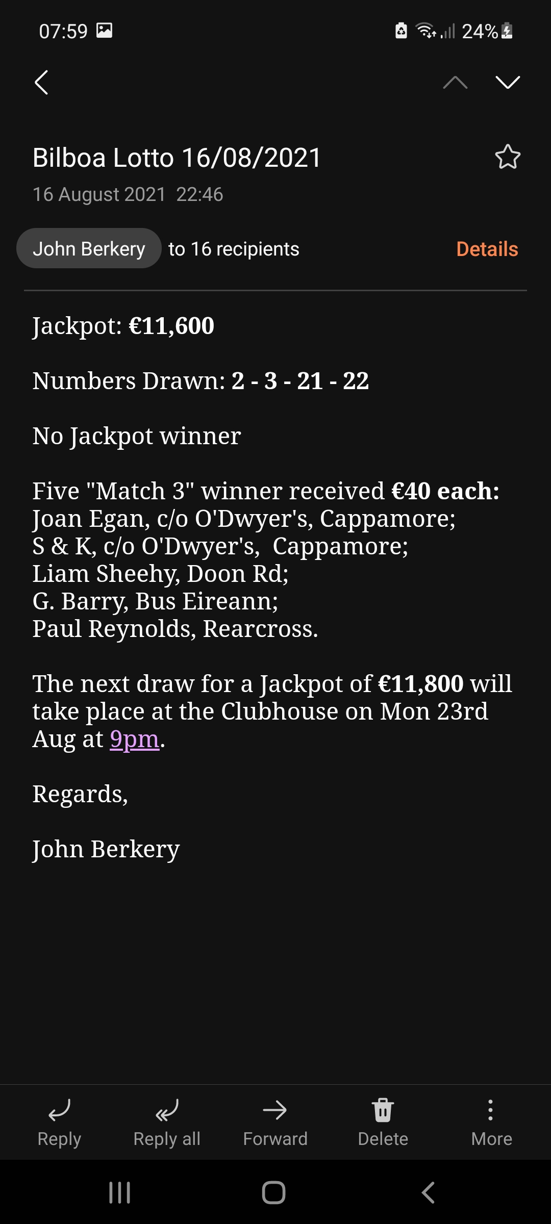 The next draw for a Jackpot of €11,600 will take place at the Clubhouse on Mon 16th Aug at 9pm.