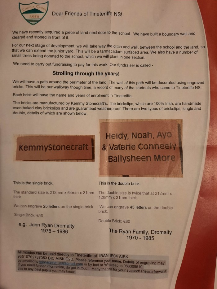 Tineteriffe National School Fundraiser -Buy a brick Posted on November 9, 2021November 9, 2021 by Cappamore Tineteriffe National School Fundraiser -Buy a brick