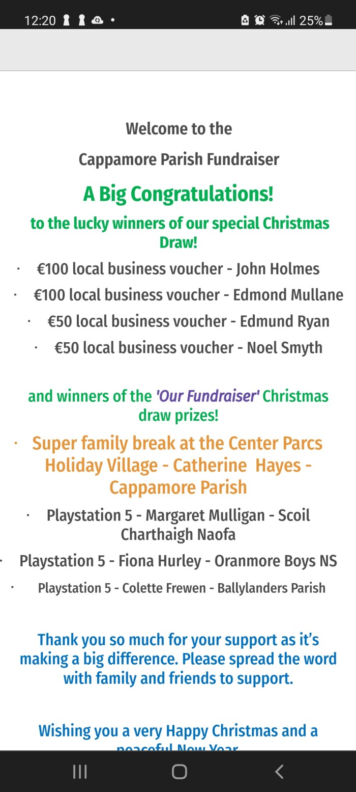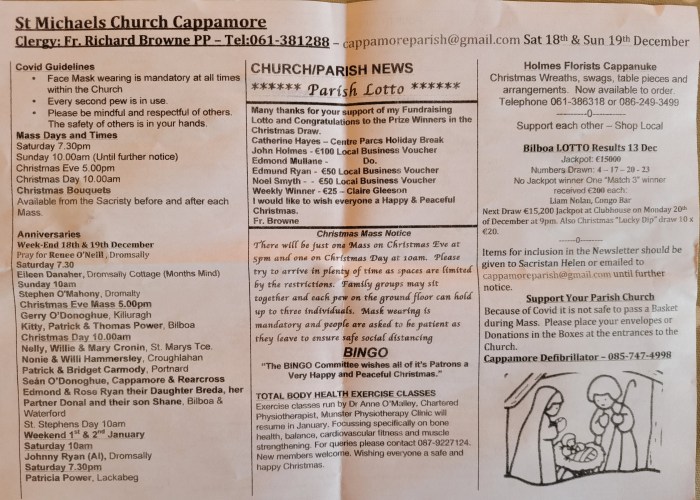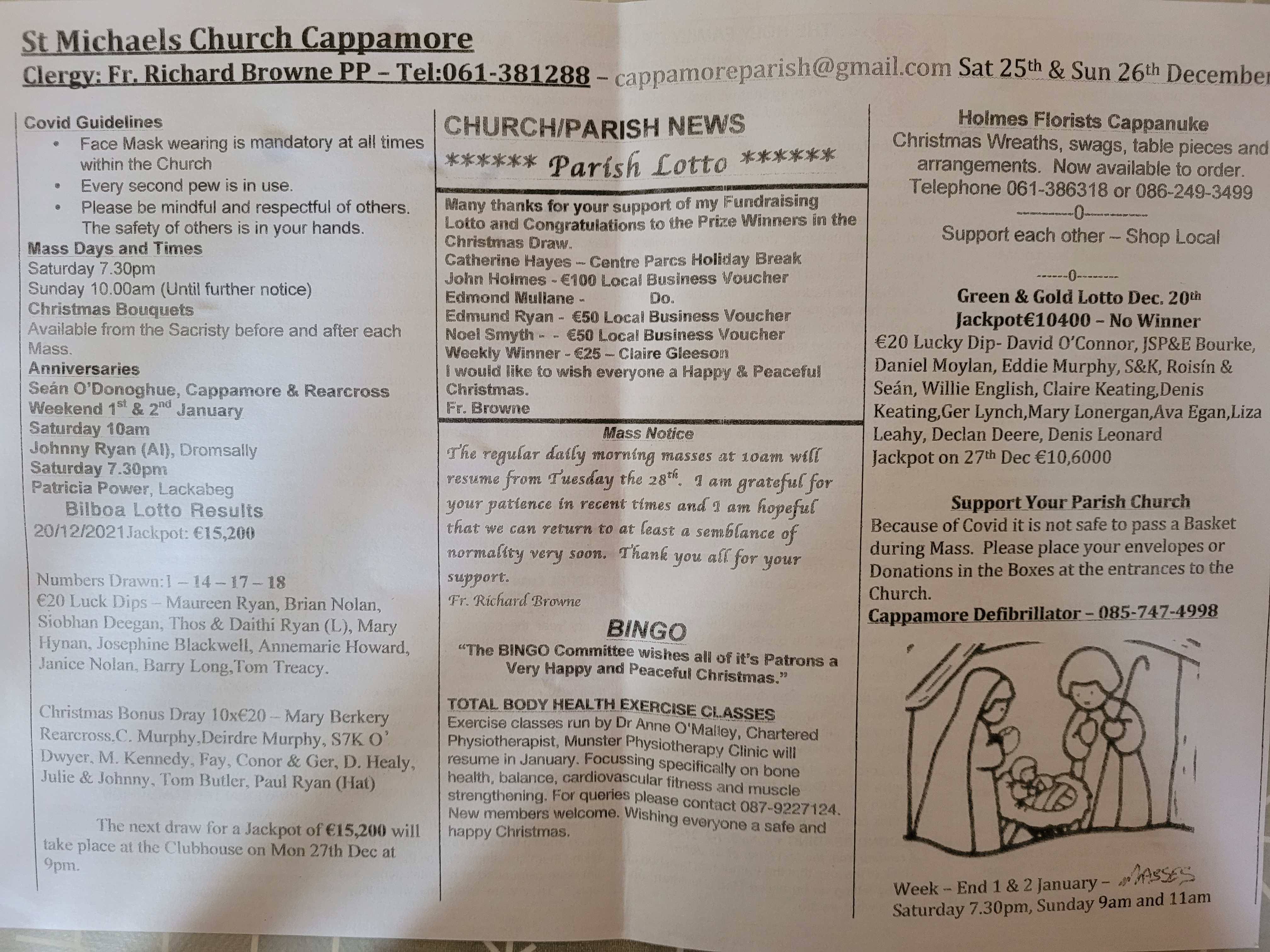 Liz and staff at St. Michael’s Day Care Centre would like to publicly thank Miss Sheehy and Junior and Senior Infants in Scoil Chaitríona for their lovely gift of chocolates and Christmas cards which arrived last Thursday. The patrons were delighted to receive the fabulous artistic Christmas cards and, as Ryan would say, ‘There was one for everyone in the audience!’ The chocolates were a great treat also. Thanks to the teacher and children for their thoughtfulness. The future is safe with kindness like that in our parish!