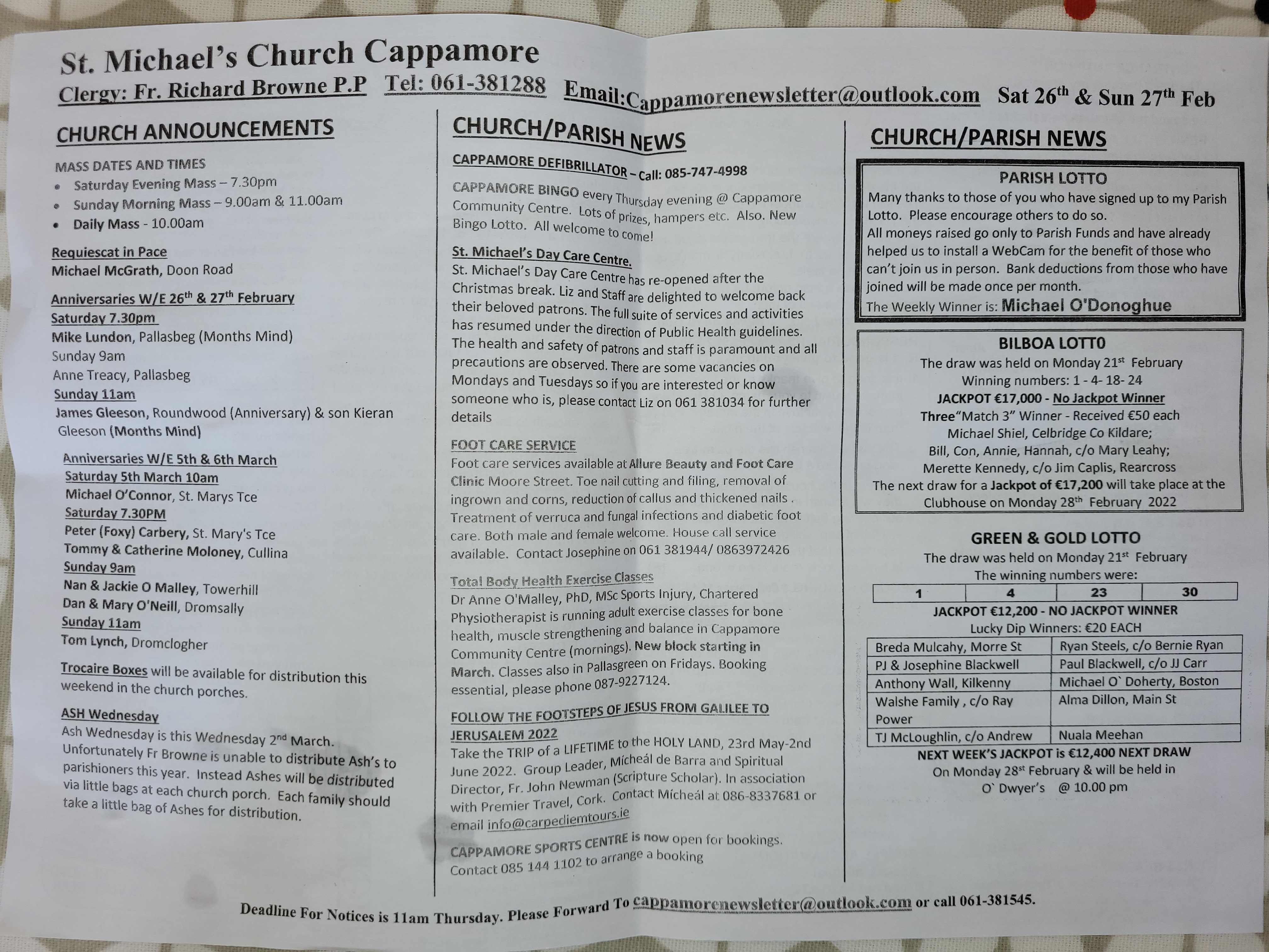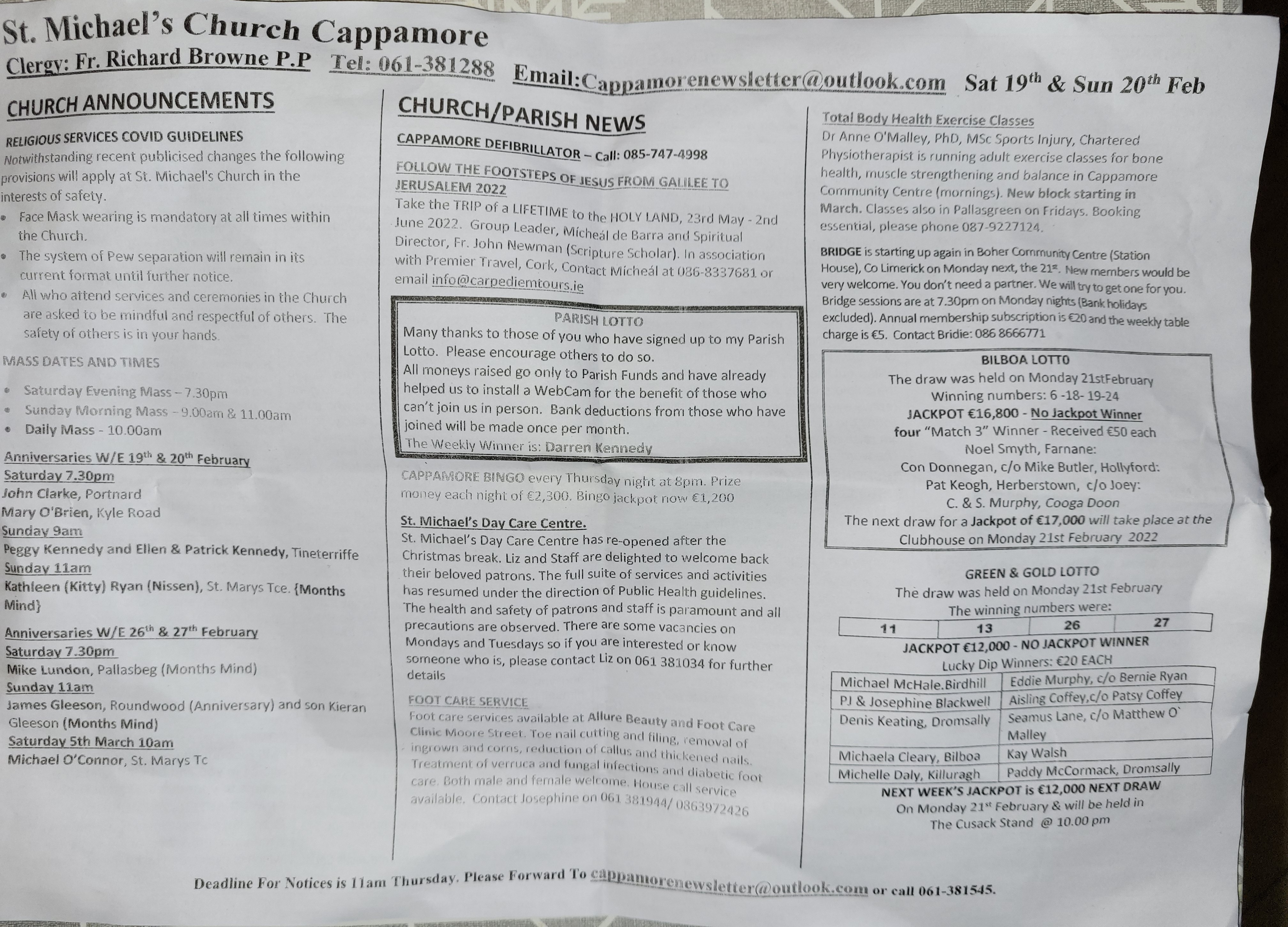 Green and Gold Lotto draw was held on Monday February 21st for Jackpot of €12200 and there was no winner. Lucky Dip winners of €20 were Breda Mulcahy, Moore St; Ryan Steels, c/o Bernie Ryan; PJ & Josephine Blackwell; Paul Blackwell, c/o JJ Carr; Anthony Wall, Kilkenny; Michael O’ Doherty, Boston; Walshe Family, c/o Ray Power; Alma Dillon, Main St; TJ McLoughlin, c/o Andrew; Nuala Meehan.