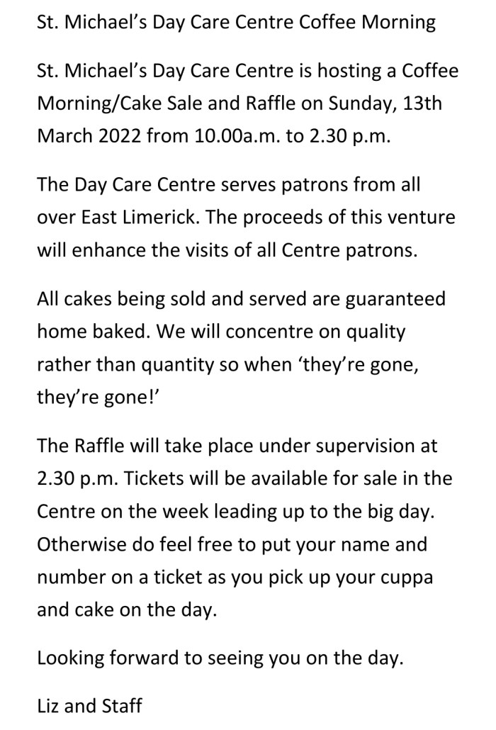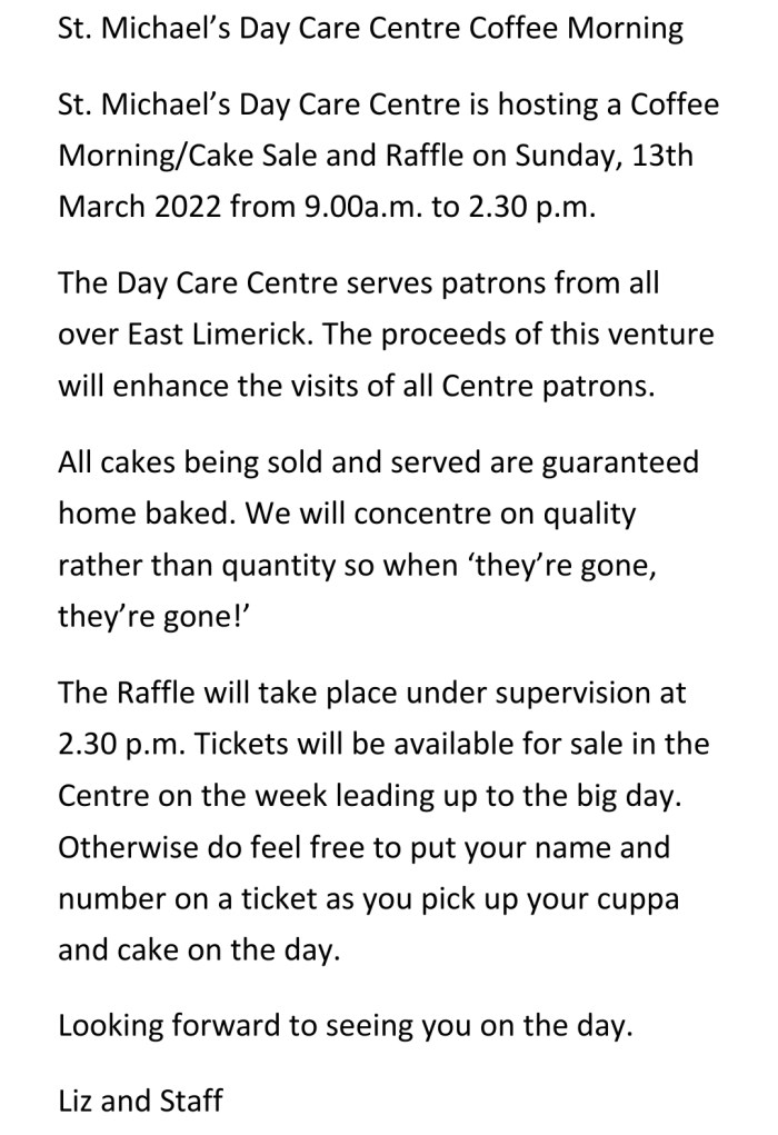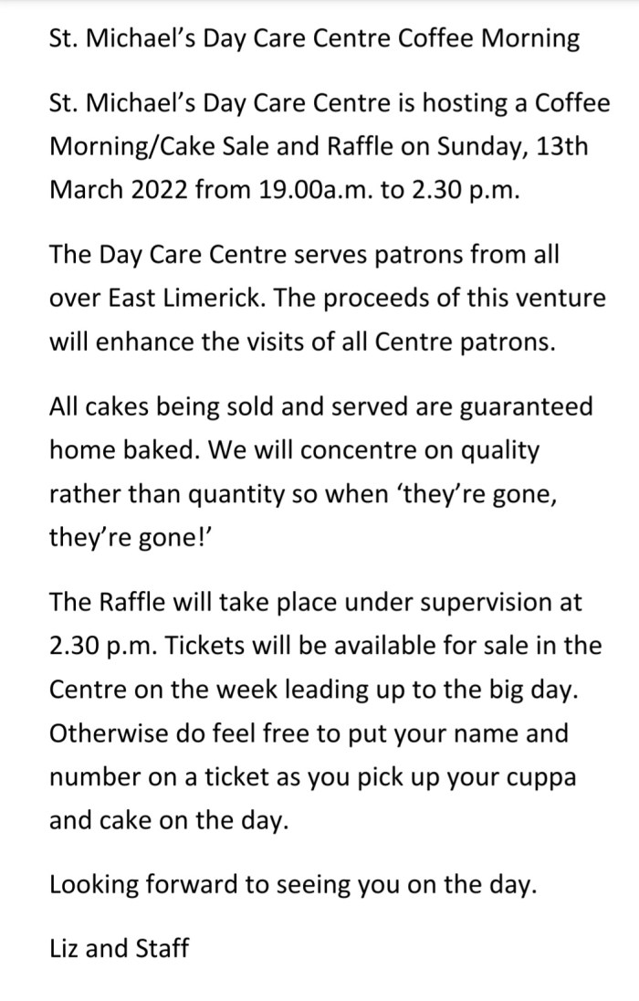 St. Michael’s Day Care Centre is hosting a Coffee Morning/Cake Sale and Raffle on Sunday, 13th March 2022 from 9.00a.m. to 2.30 p.m. The Day Care Centre serves patrons from all over East Limerick. The proceeds of this venture will enhance the visits of all Centre patrons. All cakes being sold and served are guaranteed home baked. We will concentre on quality rather than quantity so when ‘they’re gone, they’re gone!’ The Raffle will take place under supervision at 2.30 p.m. So do feel free to put your name and number on a ticket as you pick up your cuppa and cake. Looking forward to seeing you on the day. Liz and Staff
