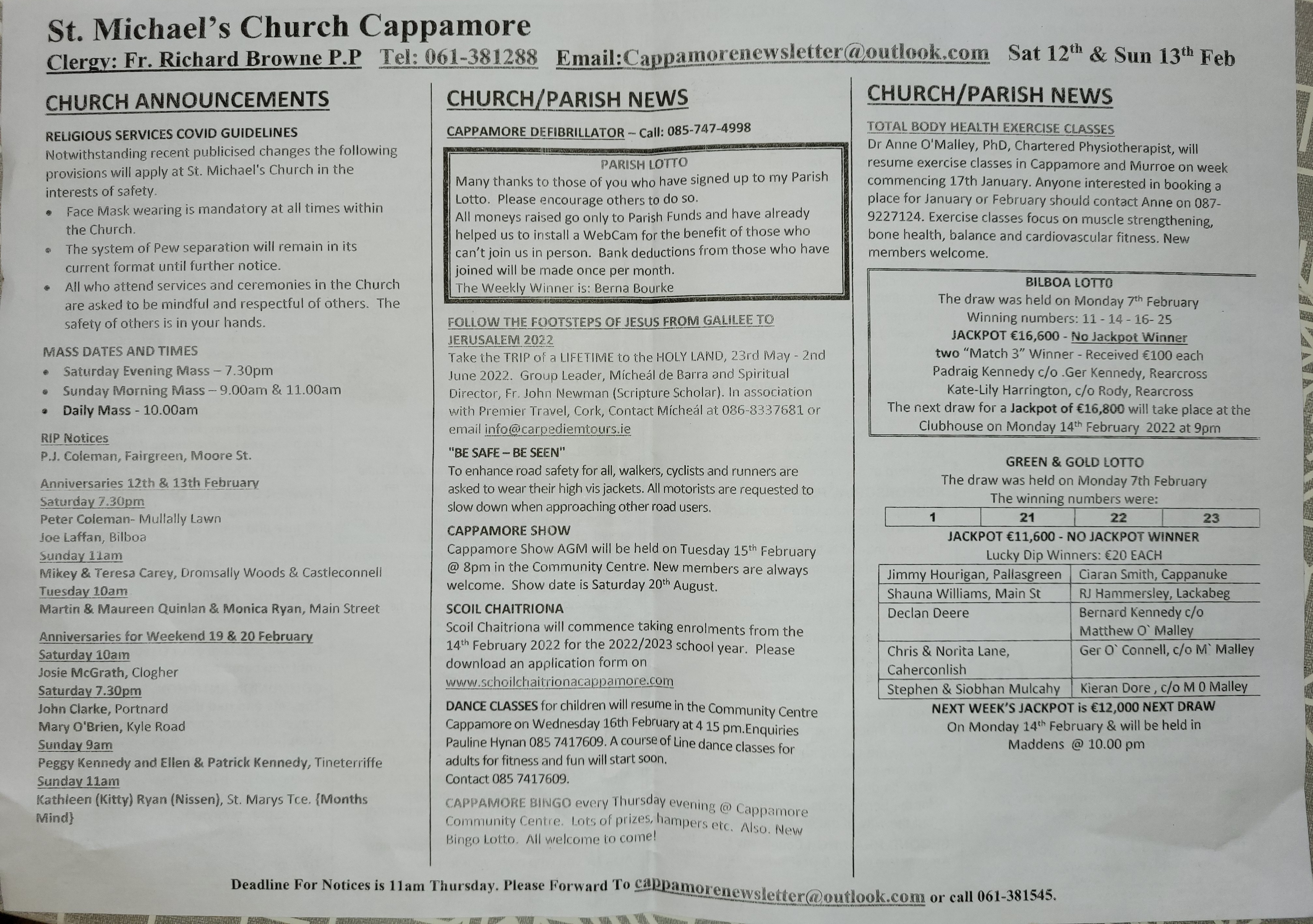 Bingo has returned and starts at 8pm with the usual great prizes to be won. We would hope people of parish would support the Valentines Bingo special 10th February with Raffle for hampers. Thanks to all who have supported bingo down the years. It is a great social night with great prizes and also Bingo Lotto to be won each night.