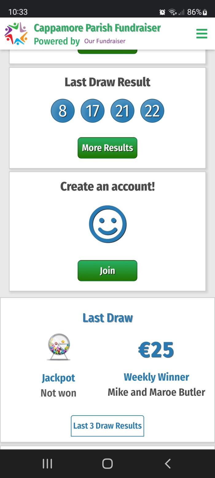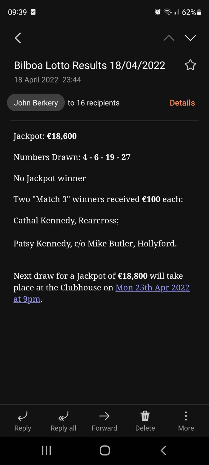 The Jackpot was €18,800. Numbers Drawn: 12 – 13 – 19 – 24. No Jackpot winner. Three “Match 3” winners received €70 each: Donal Nolan, Rearcross; Una McNamara, c/o Jerry Duggan; Conor Richardson, Rearcross, c/o T. J. Devitt. Next draw for a Jackpot of €19,000 will take place at the Clubhouse on Mon 2nd May 2022 at 9pm.