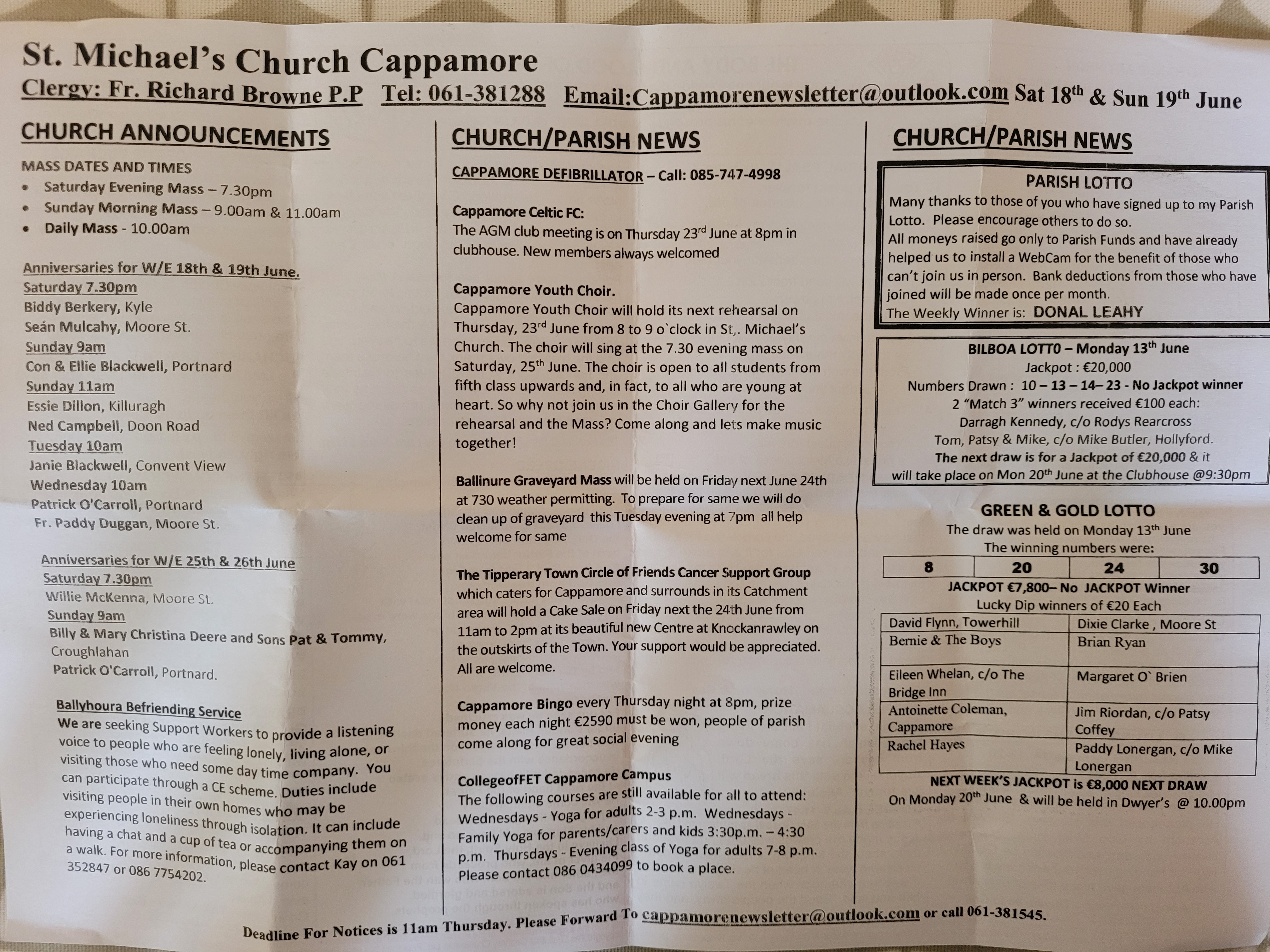 Green and Gold Lotto draw was held on Monday June 13th for Jackpot of €7800 and there was no winner. Lucky Dip winners are David Flynn Towerhill; Dixie Clarke, Moore St; Bernie & The Boys; Brian Ryan; Eileen Whelan, c/o The Bridge Inn; Margaret O’ Brien; Antoinette Coleman, Cappamore; Jim Riordan, c/o Patsy Coffey; Rachel Hayes; Paddy Lonergan, c/o Mike Lonergan.