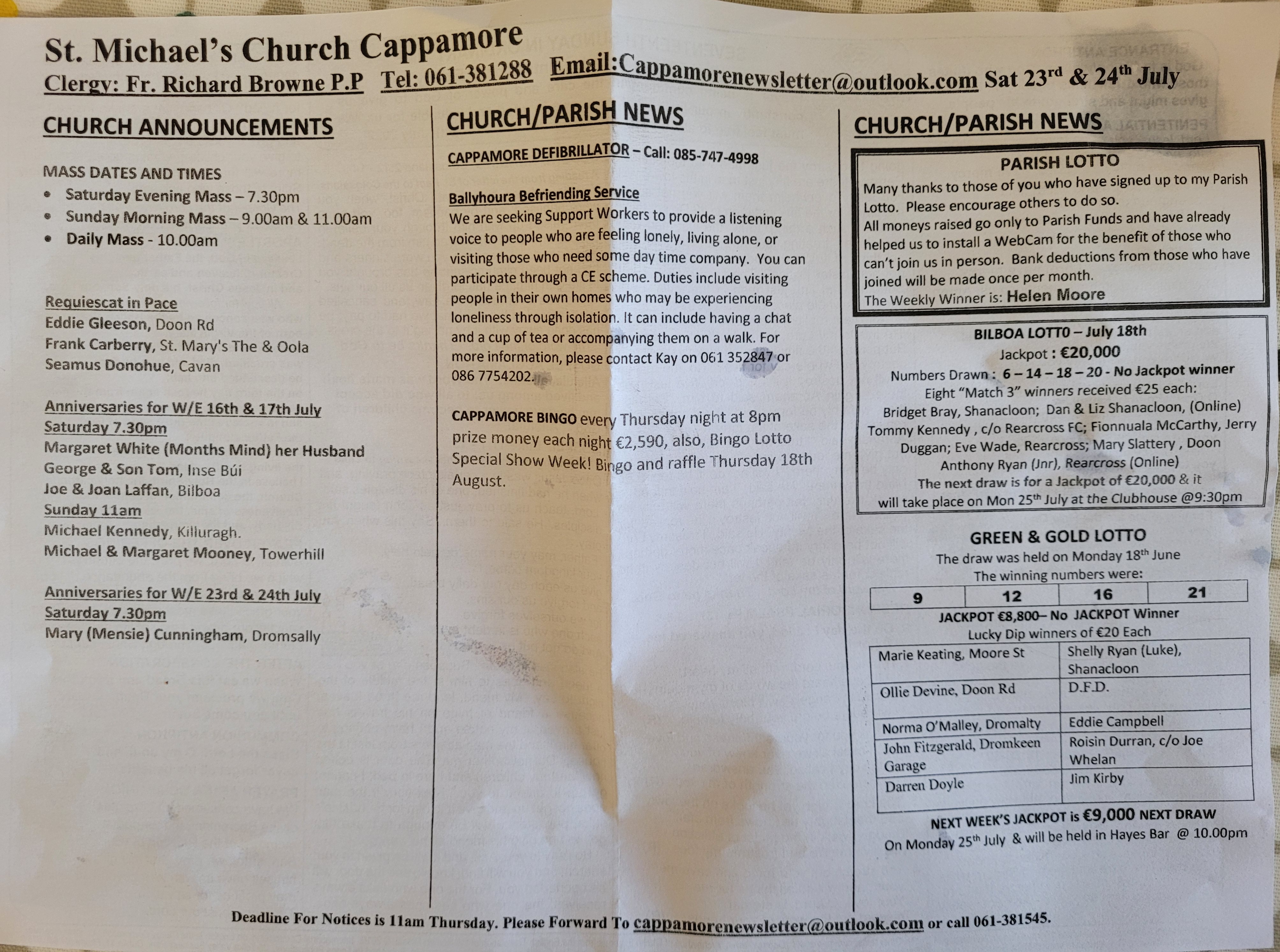 Green and Gold Lotto draw was held on Monday July 19th for Jackpot of €8800 and there was no winner. Lucky Dip winners were Marie Keating, Moore St; Shelly Ryan (Luke), Shanacloon; Ollie Devine, Doon Rd; D.F.D.; Norma O’ Malley, Dromalty; Eddie Campbell; John Fitzgerald, Dromkeen Garage; Roisin Curran, c/o Joe Whelan; Darren Doyle; Jim Kirby.