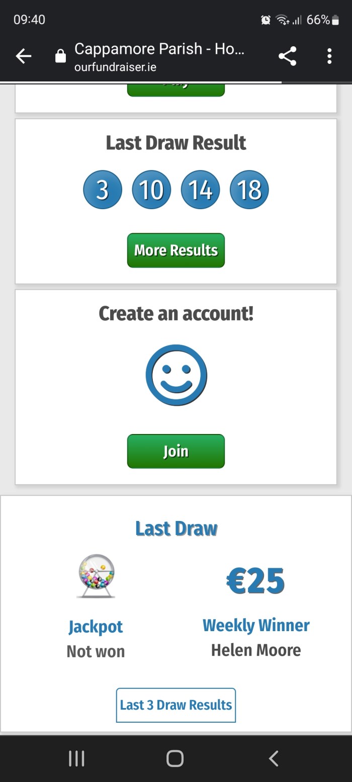 Next draw for a Jackpot of €20,000 will take place at the Clubhouse on Mon 18th Jul 2022 at 9:30pm.