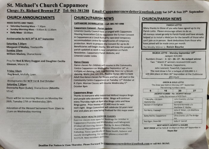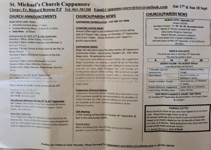 In conjunction with Milford Hospice Coffee Day Cappamore Bingo Committee are holding a special Bingo on Thursday night September 22nd at 8pm with 2600 prize money to be won also on same night O’ Dwyers Bar and Lounge are holding their annual coffee evening we would ask people of parish and local areas to support same or donations can be given to any of the fundraising events Cappamore Bingo celebrate 50 years next year and are now planning for this major event