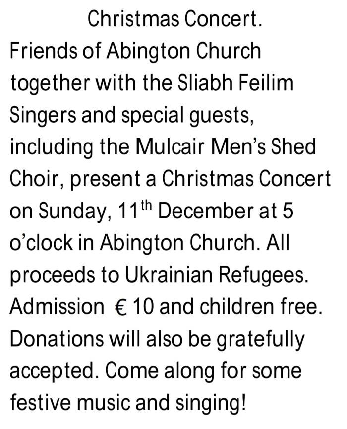 Christmas Concert in Abington Church Sun 11th Dec at 5pm Posted on November 28, 2022November 28, 2022 by Cappamore Christmas Concert in Abington Church Sun 11th Dec at 5pm