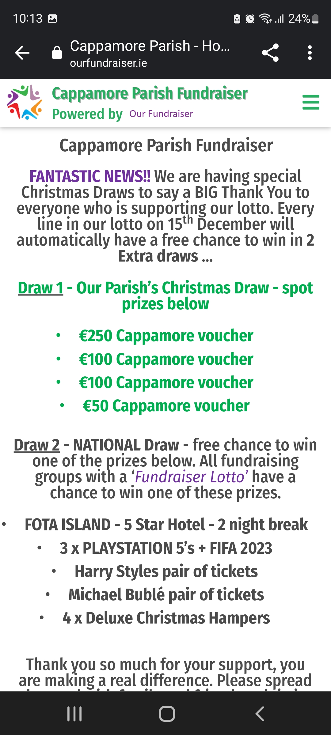 Cappamore St Michael’s Church Lotto special draw Posted on December 2, 2022December 2, 2022 by Cappamore Cappamore St Michael’s Church Lotto special draw