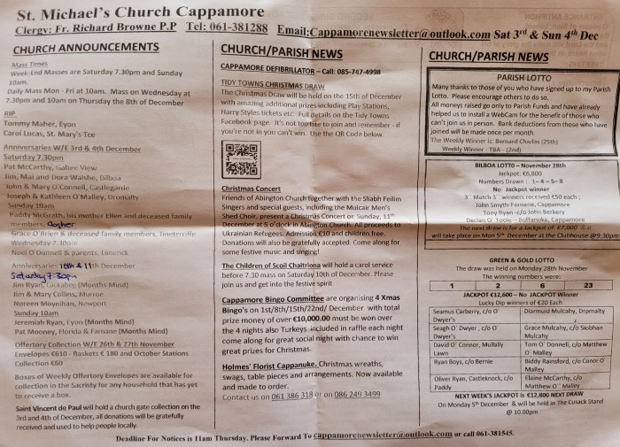 Cappamore Church and Parish Newsletter Posted on December 4, 2022April 11, 2023 by Cappamore Cappamore Church and Parish Newsletter