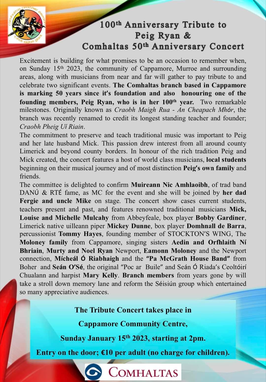 100th Anniversary Tribute Concert for Peig Ryan and celebrating 50years of Comhaltas in Cappamore Posted on January 3, 2023January 3, 2023 by Cappamore 100th Anniversary Tribute Concert for Peig Ryan and celebrating 50years of Comhaltas in Cappamore