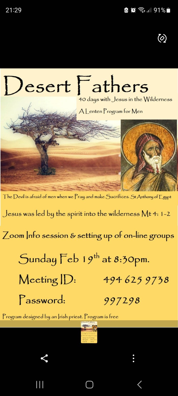 A lenten program for men has been developed by an Irish priest to help men make this Lent different. The program contains 4 pillars – Prayer, Penance, Spiritual reading & Charity. To find out more and join an online group a zoom information meeting is scheduled for Sunday Feb 19th at 8:30pm. Meeting ID 494 625 9738 Password: 997298. Email desertfathers40 for a copy of the program.
