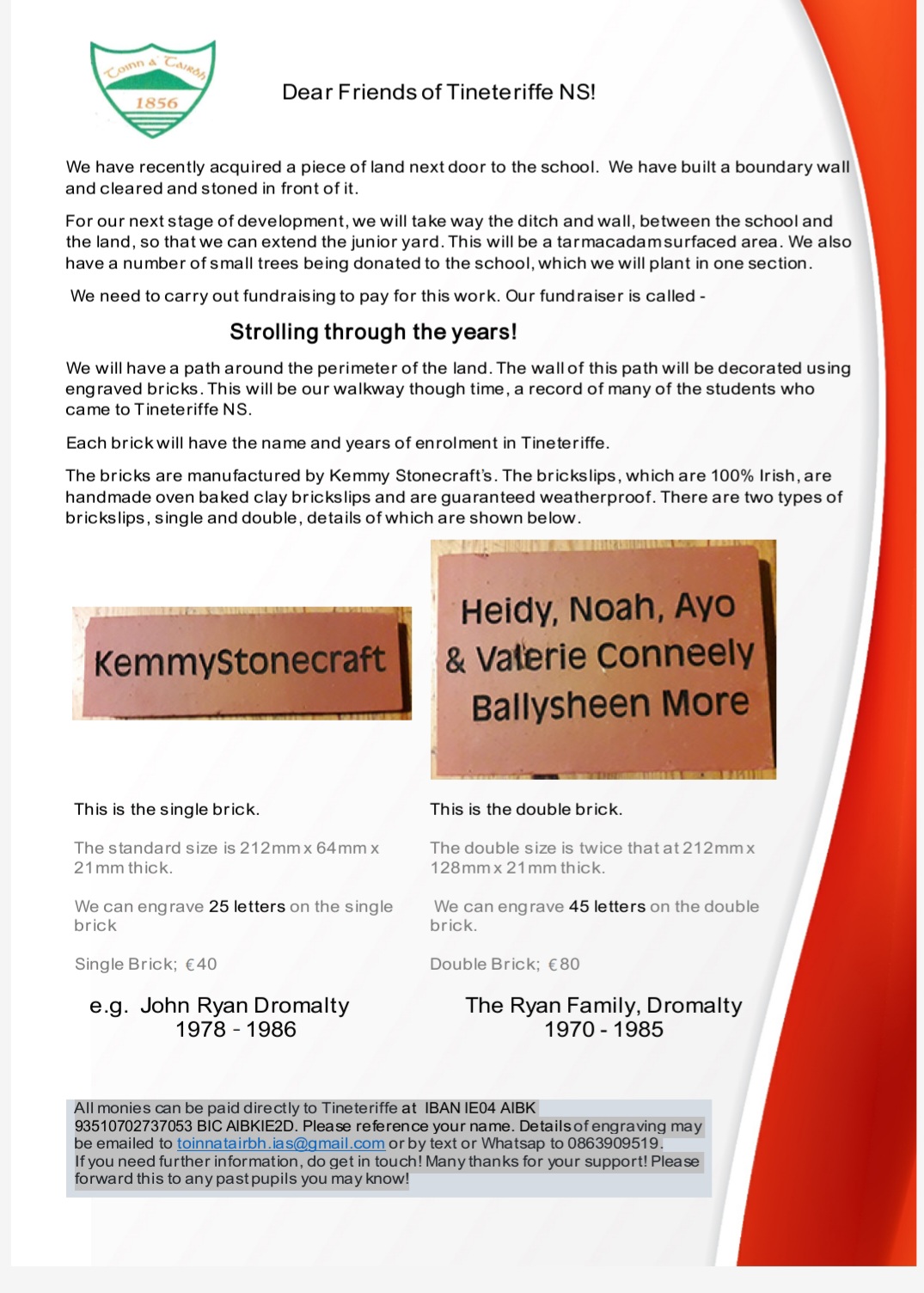 Come and join our “Stroll through time” past and present pupils of Tineteriffe! Have a look at those installed (just inside the new wall). Contact Kay in the office 9.15 to 12.15 or email toinnatairbh.ias@gmail.com