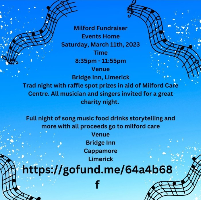 Fundraiser at Maddens Bridge Inn Cappamore on March 11th in aid of Milford Hospice. A traditional night with food , live music, raffles and a gathering in memory of the late Thomas Brazil , Mullally Lawns. Musicans are invited. For further details , please contact Breda O’Dwyer at bredaodwyer05@gmail.com