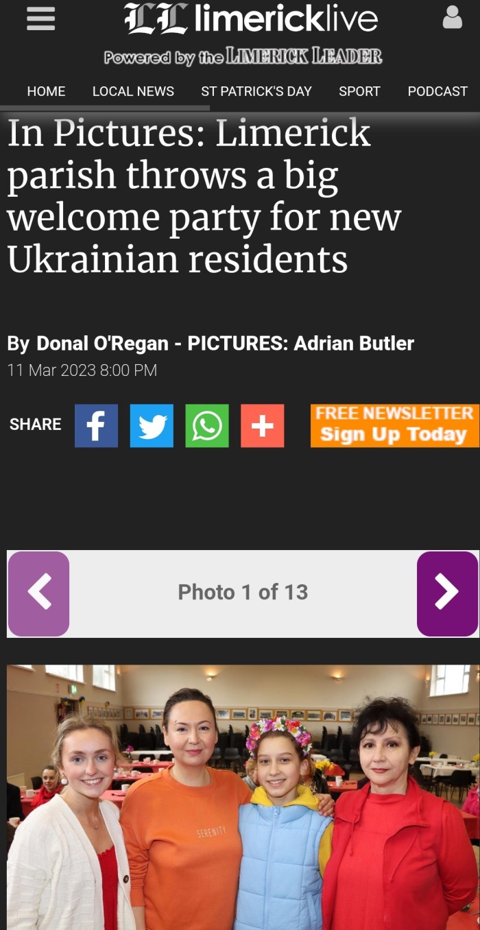 Limerick Leader – Cappamore parish throws a big welcome party for new Ukrainian residents Posted on March 12, 2023March 12, 2023 by Cappamore Link to Limerick Leader Article https://www.limerickleader.ie/news/home/1058172/in-pictures-limerick-parish-throws-a-big-welcome-party-for-new-ukrainian-residents.html