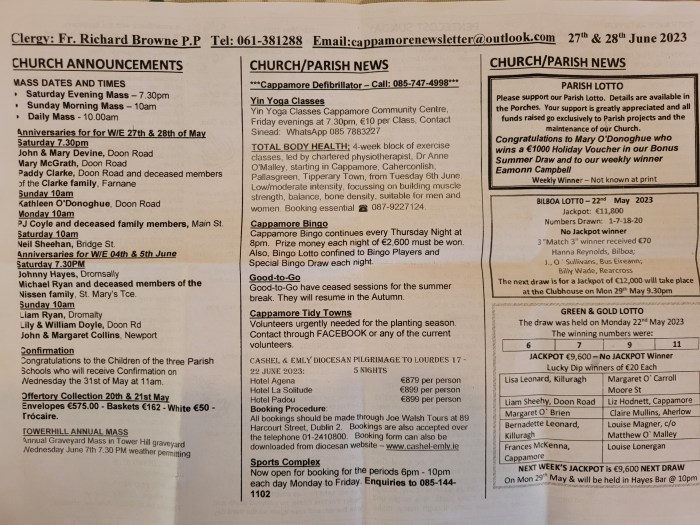 Green and Gold Lotto draw was held on Monday May 15th for Jackpot of €9200 and there was no winner. Lucky Dip winners were Tamara Morrissey, Pallasgreen; Rita Brehney; Holly Sheehy, Doon Road; Dan O’ Brien, c/o Elaine O’ Brien; J B M; Paddy McCarthy, Bridge Street; Padraig O’ Donoghue, Dromsally; Charlie McCarthy c/o Matthew O’ Malley; Josie Kett, Murroe; Sadie Hogan, Turagh.