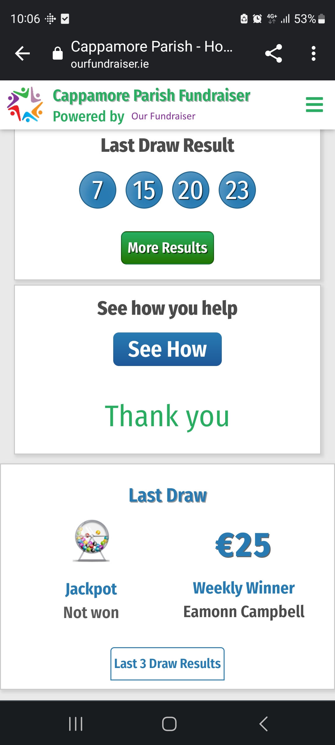 Next draw for a Jackpot of €12,000 will take place at the Clubhouse on Mon 29th May 2023 at 9:30pm.