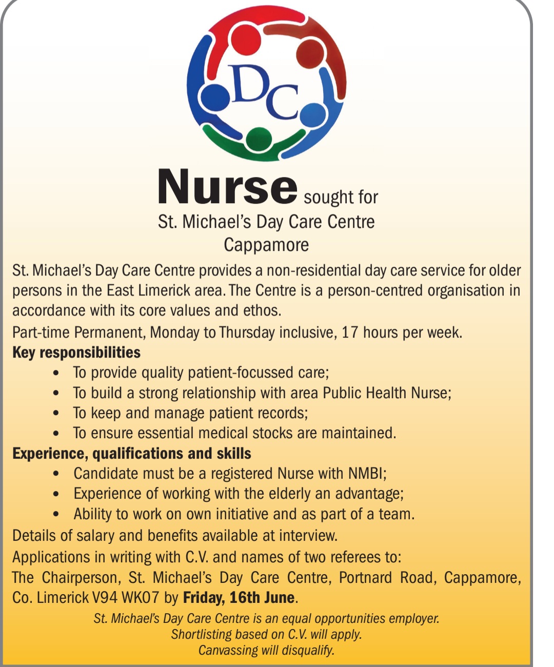 A vacancy exists in St Michael’s Day Care Centre for a Nurse. Please see advertisement in this week’s Limerick Post for full details.