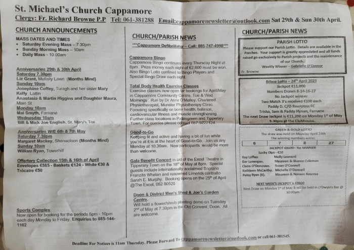Cappamore Church and Parish Newsletter Posted on May 1, 2023July 3, 2023 by Cappamore Cappamore Church and Parish Newsletter
