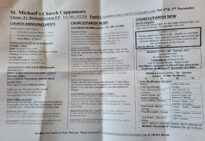 Cappamore Church and Parish Newsletter Posted on November 5, 2023November 5, 2023 by Cappamore Cappamore Church and Parish Newsletter
