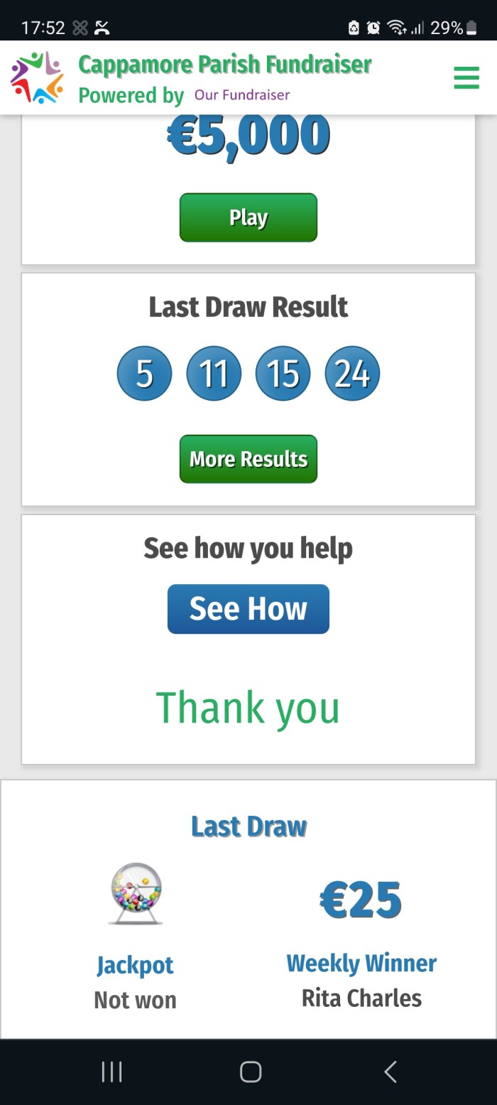 The jackpot of €2,600 was not won. The umbers drawn were 1 – 4 – 6 – 11. Four “Match 3” winners received €50 each: Bernie Shanahan, c/o Jerry Duggan; Sean Meehan, Portnard (Online); Michael Clifford, c/o Rearcross FC; Ryan (A) Family, Doon.