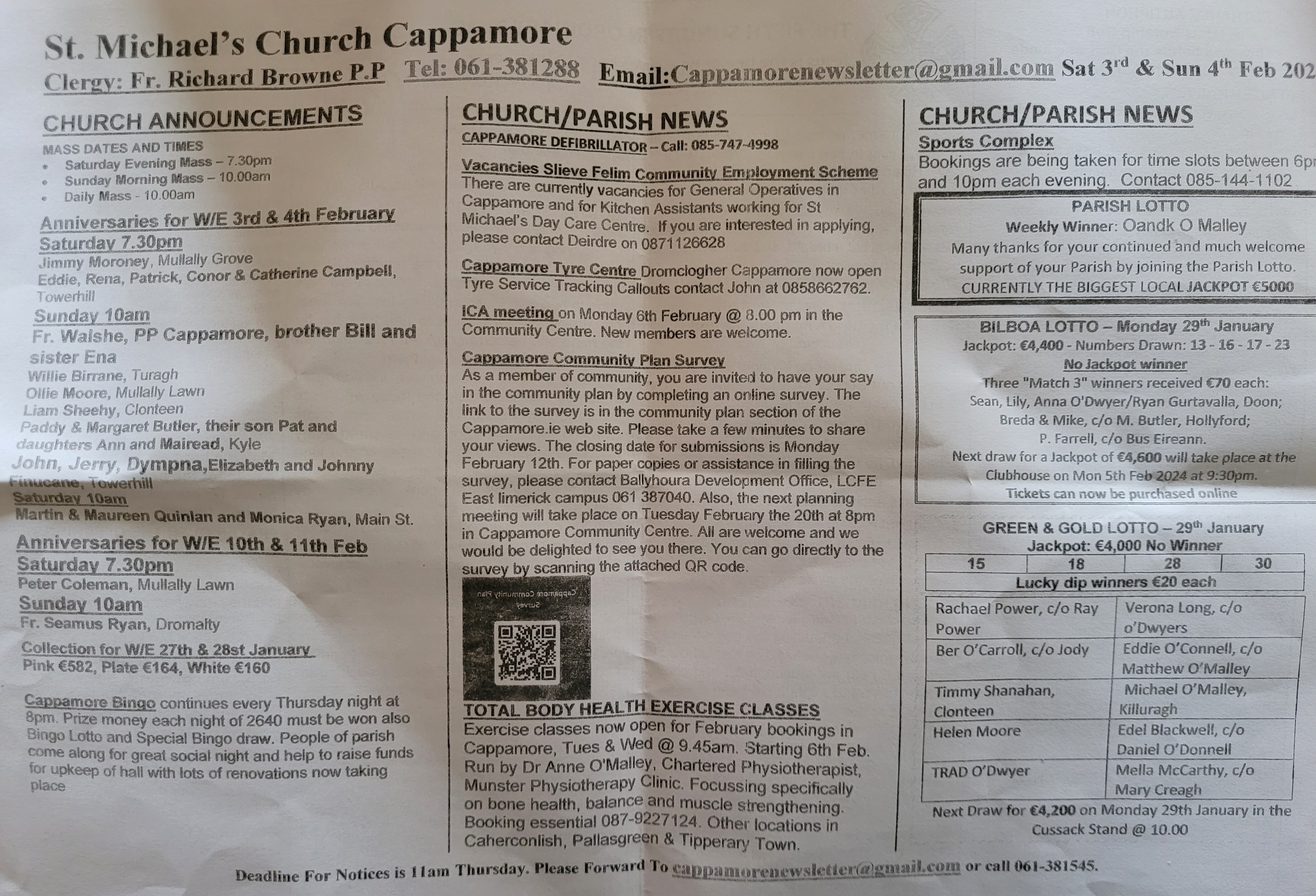 Cappamore Church and Parish Newsletter Posted on February 4, 2024February 4, 2024 by Cappamore Cappamore Church and Parish Newsletter