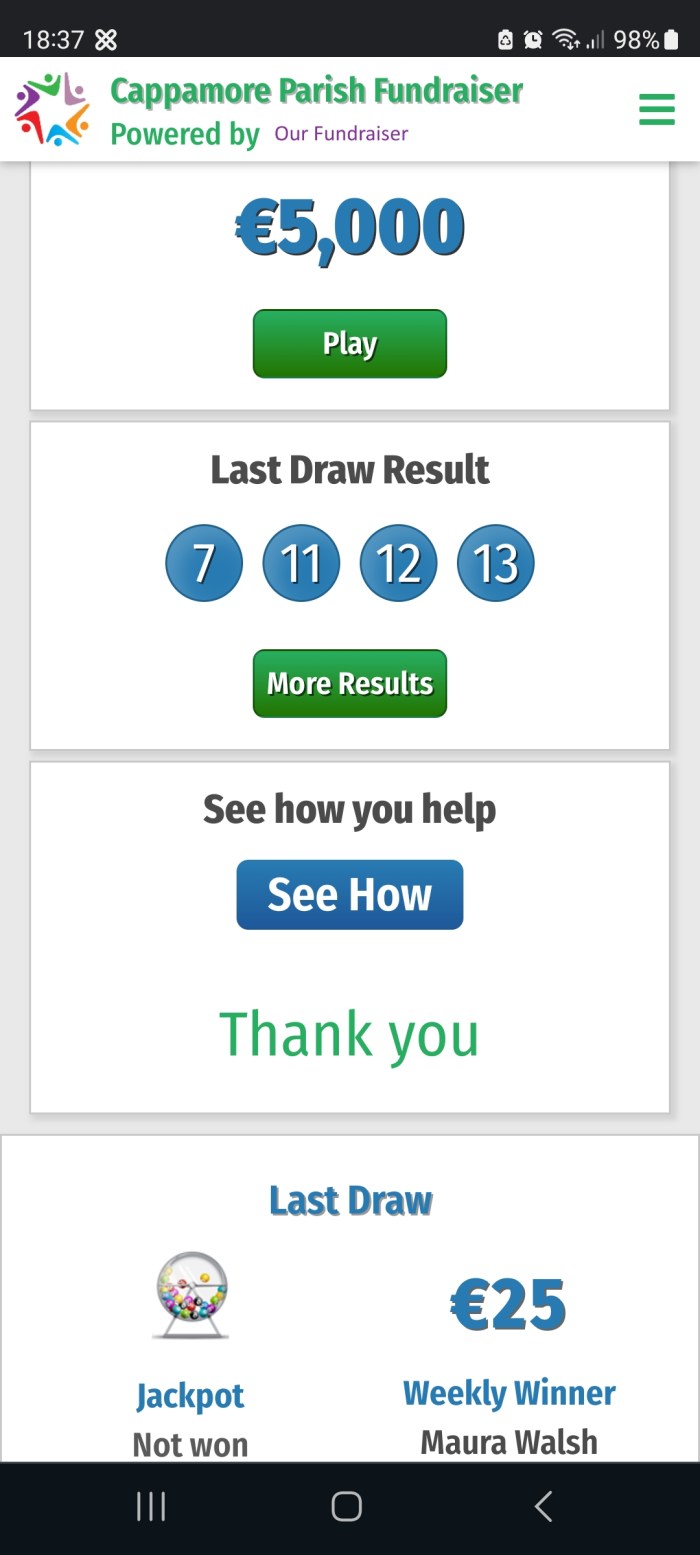 The jackpot €5,600 was not won. The numbers drawn were 3 – 14 – 15 – 23. Four “Match 3” winner received €50: Benny Coen, c/o Rearcross FC; Billy Wade, Rearcross; Michelle Berkery, Shanaclune, C/more;
