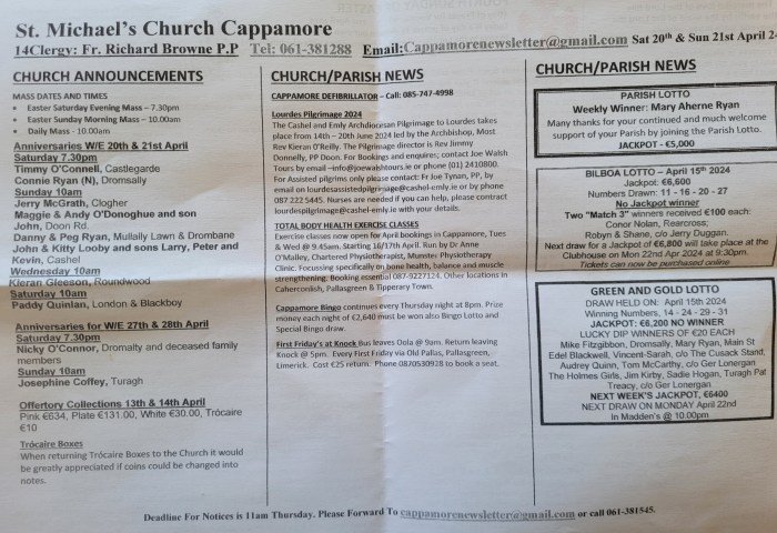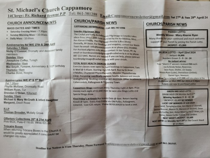 Green and Gold Lotto draw was held on Monday April 15th for Jackpot of €6200 and there was no winner. Lucky Dip winners Mike Fitzgibbon, Dromsally; Mary Ryan, Main St; Edel Blackwell; Vincent-Sarah, c/o The Cusack Stand; Audrey Quinn; Tom McCarthy, c/o Ger Lonergan; The Holmes Girls; Jim Kirby; Sadie Hogan, Turagh; Pat Treacy, c/o Ger Lonergan