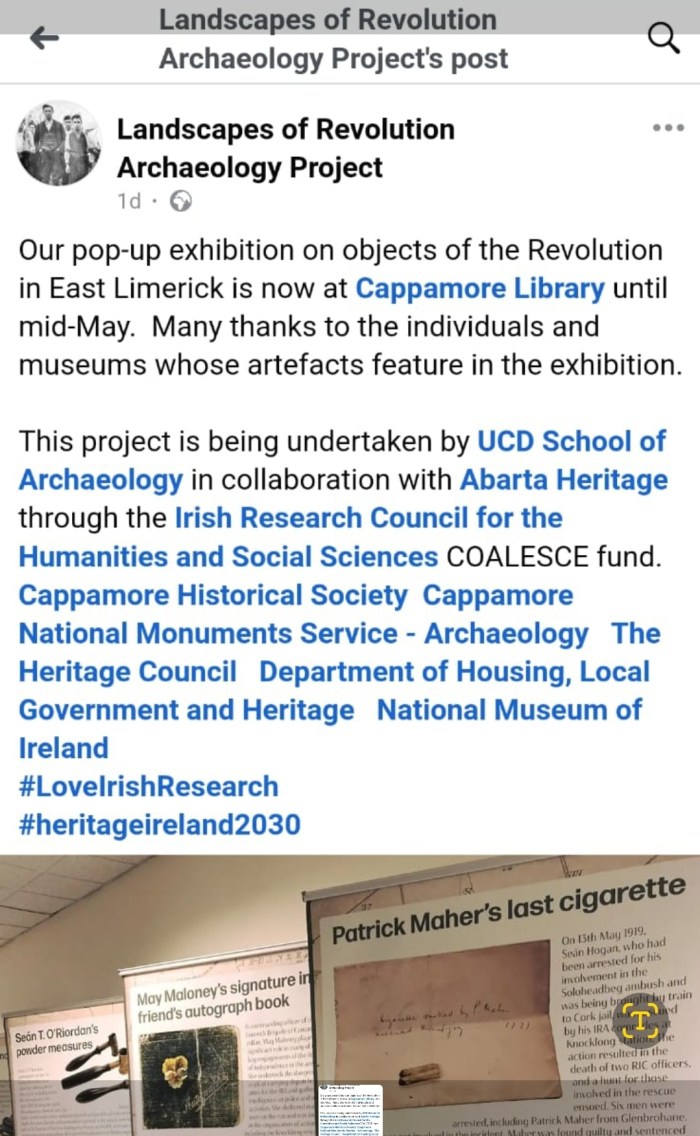 There is a pop-up exhibition on objects of the Revolution in East Limerick is now open at Cappamore Library until mid-May. Many thanks to the individuals and museums whose artefacts feature in the exhibition.